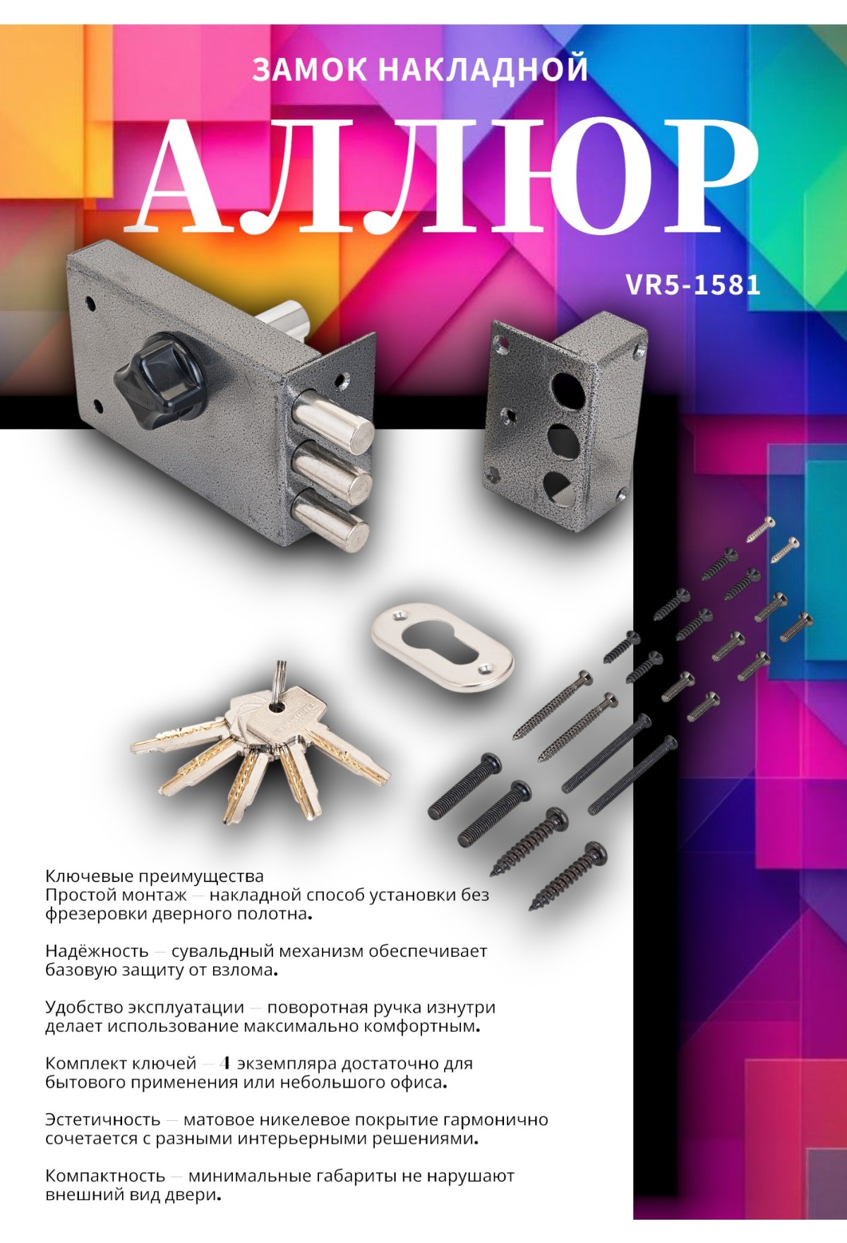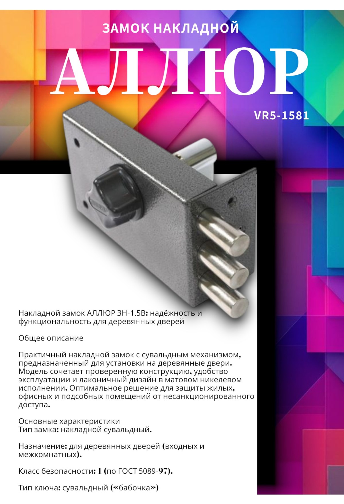 Тэги: АЛЛЮР ЗН 1-5 В Замок накладной (20), VR5-1581, Аллюр, ✹ Дверные замки, механизмы, ✹ Замки накладные для деревянных дверей, ✹ Дверная фурнитура