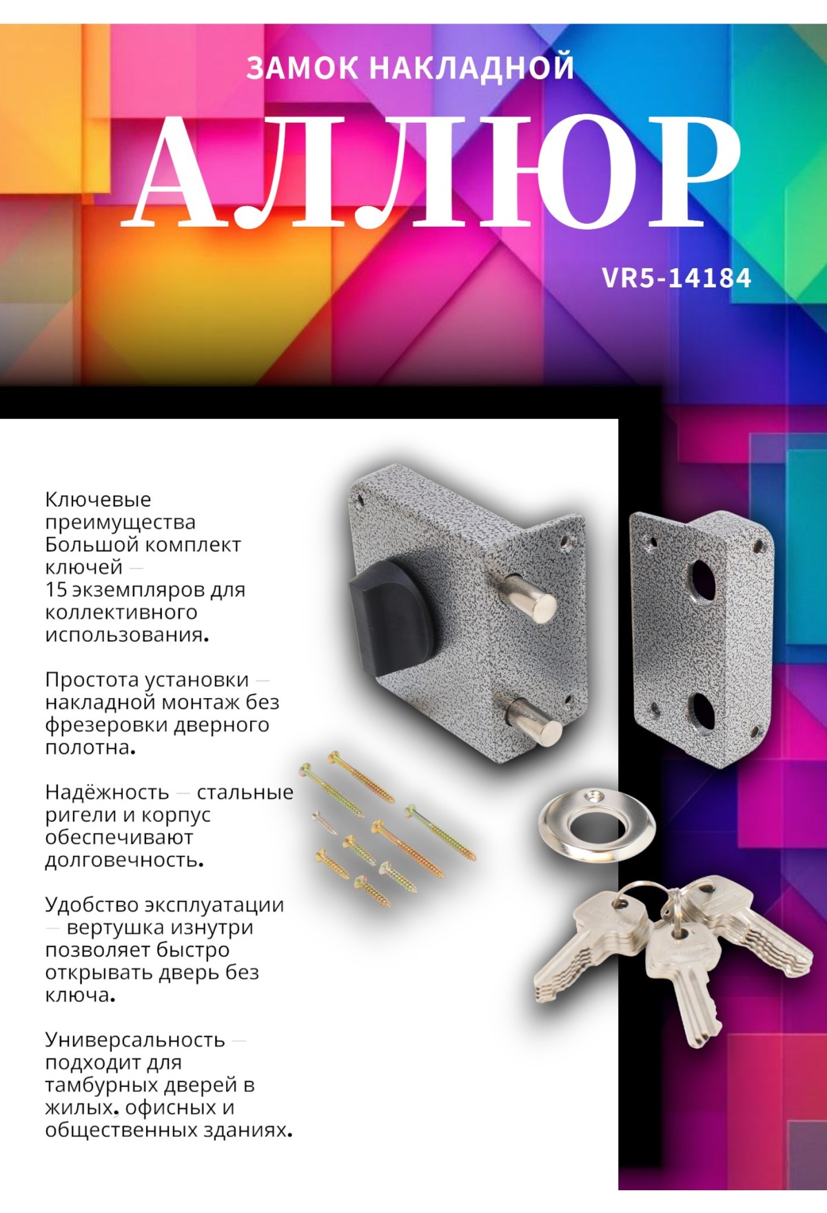 Цилиндровый накладной замок с вертушкой, специально разработанный для установки на тамбурные (секционные) двери. Модель обеспечивает базовый уровень защиты при высокой эксплуатационной удобности. В комплект входит 15 ключей — практичное решение для мест с большим количеством пользователей.