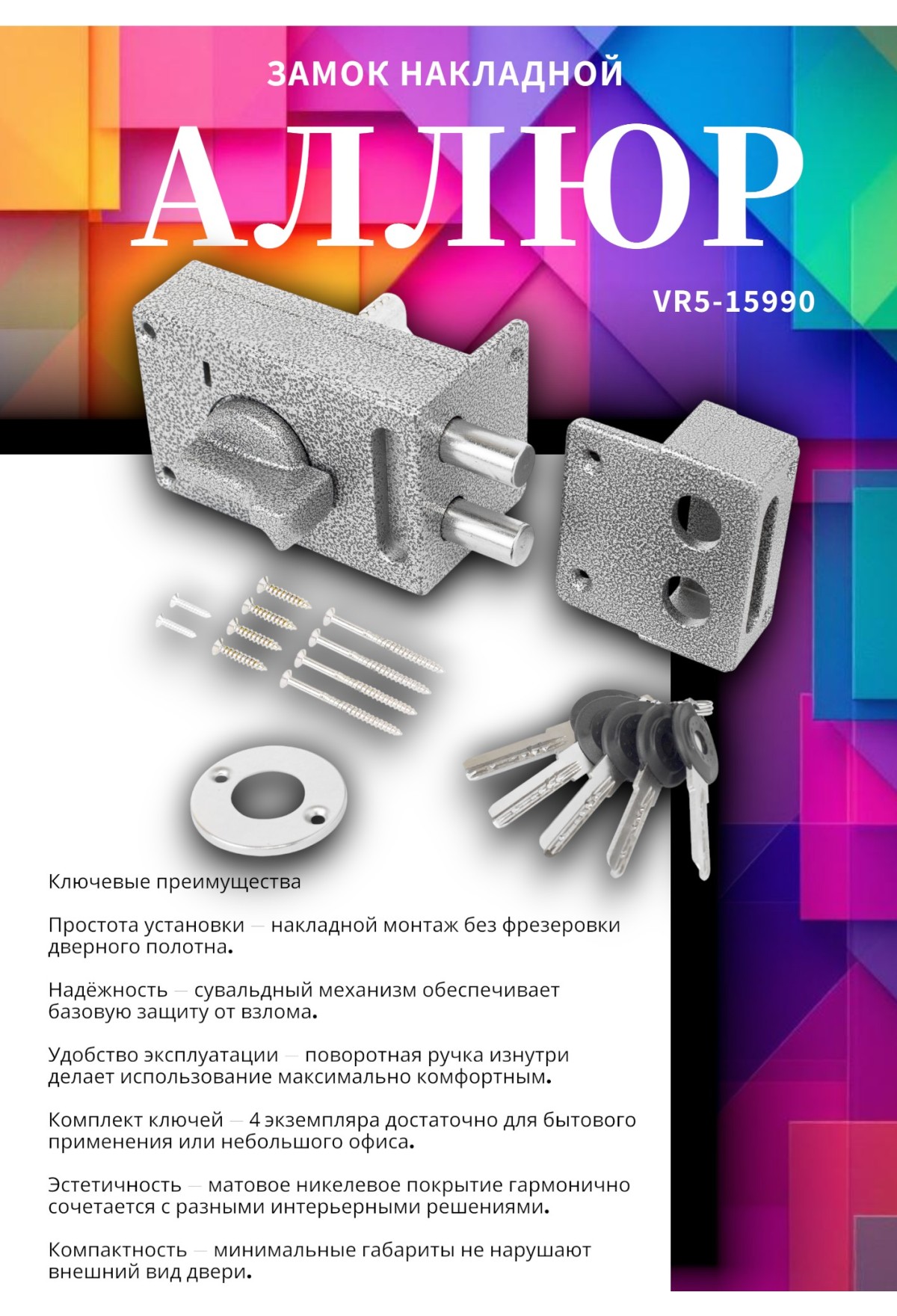 Накладной сувальдный замок АЛЛЮР ЗН1‑М1 — практичное решение для защиты деревянных дверей. Модель сочетает проверенную конструкцию, простоту установки и лаконичный дизайн в матовом никелевом исполнении. Подходит для жилых, офисных и подсобных помещений, где необходим базовый уровень защиты от несанкционированного доступа.