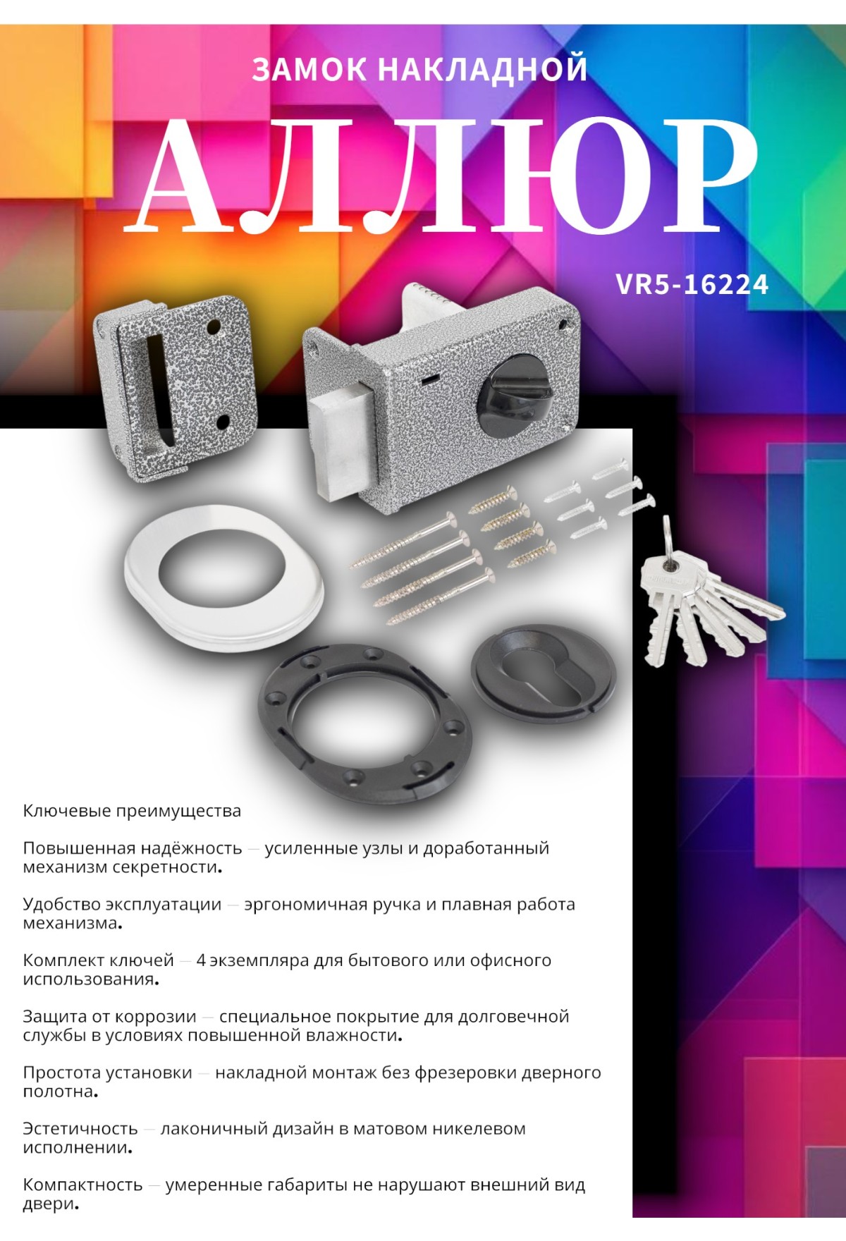 Современный накладной замок с сувальдным механизмом для деревянных дверей. Модель отличается повышенной прочностью, удобством эксплуатации и лаконичным дизайном в матовом никелевом исполнении. Оптимальное решение для помещений, где требуется базовая защита с улучшенными эксплуатационными характеристиками.