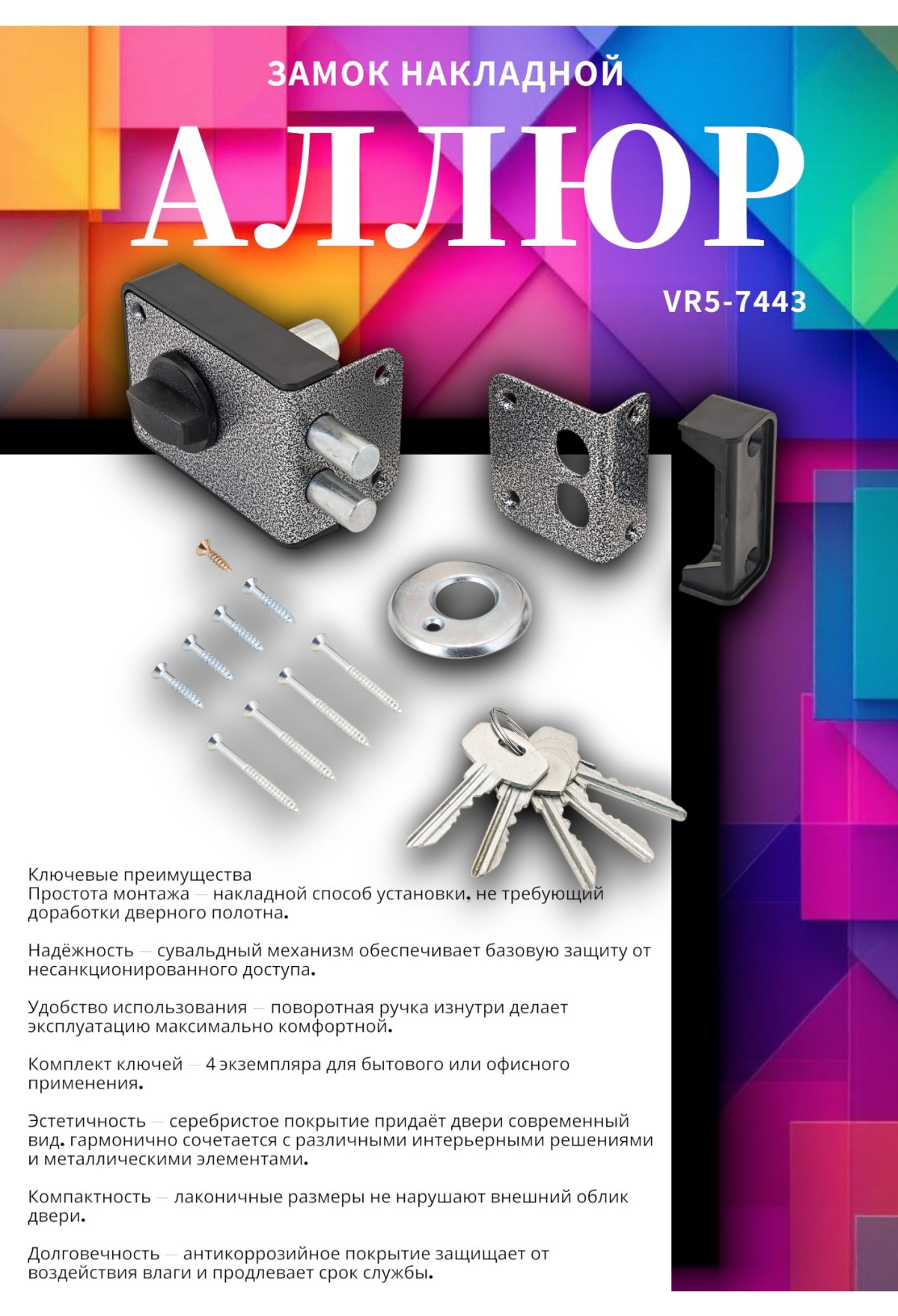 Практичный накладной замок с сувальдным механизмом, разработанный для установки на деревянные двери. Модель сочетает проверенную конструкцию, удобство эксплуатации и лаконичный внешний вид в серебристом исполнении. Оптимальное решение для помещений, где важны базовая защита и современный эстетический облик.