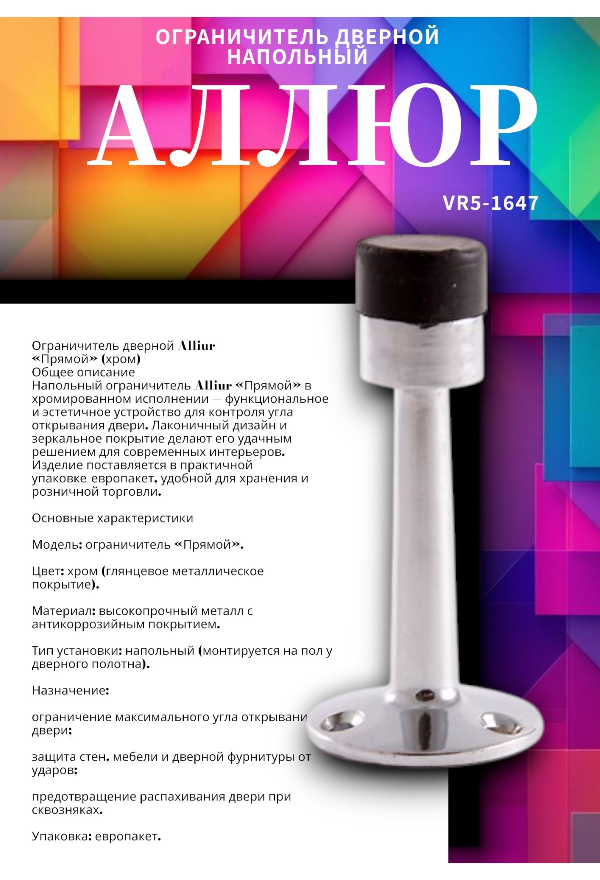 Напольный ограничитель Alliur «Прямой» в хромированном исполнении — функциональное и эстетичное устройство для контроля угла открывания двери. Лаконичный дизайн и зеркальное покрытие делают его удачным решением для современных интерьеров. Изделие поставляется в практичной упаковке‑европакет, удобной для хранения и розничной торговли.