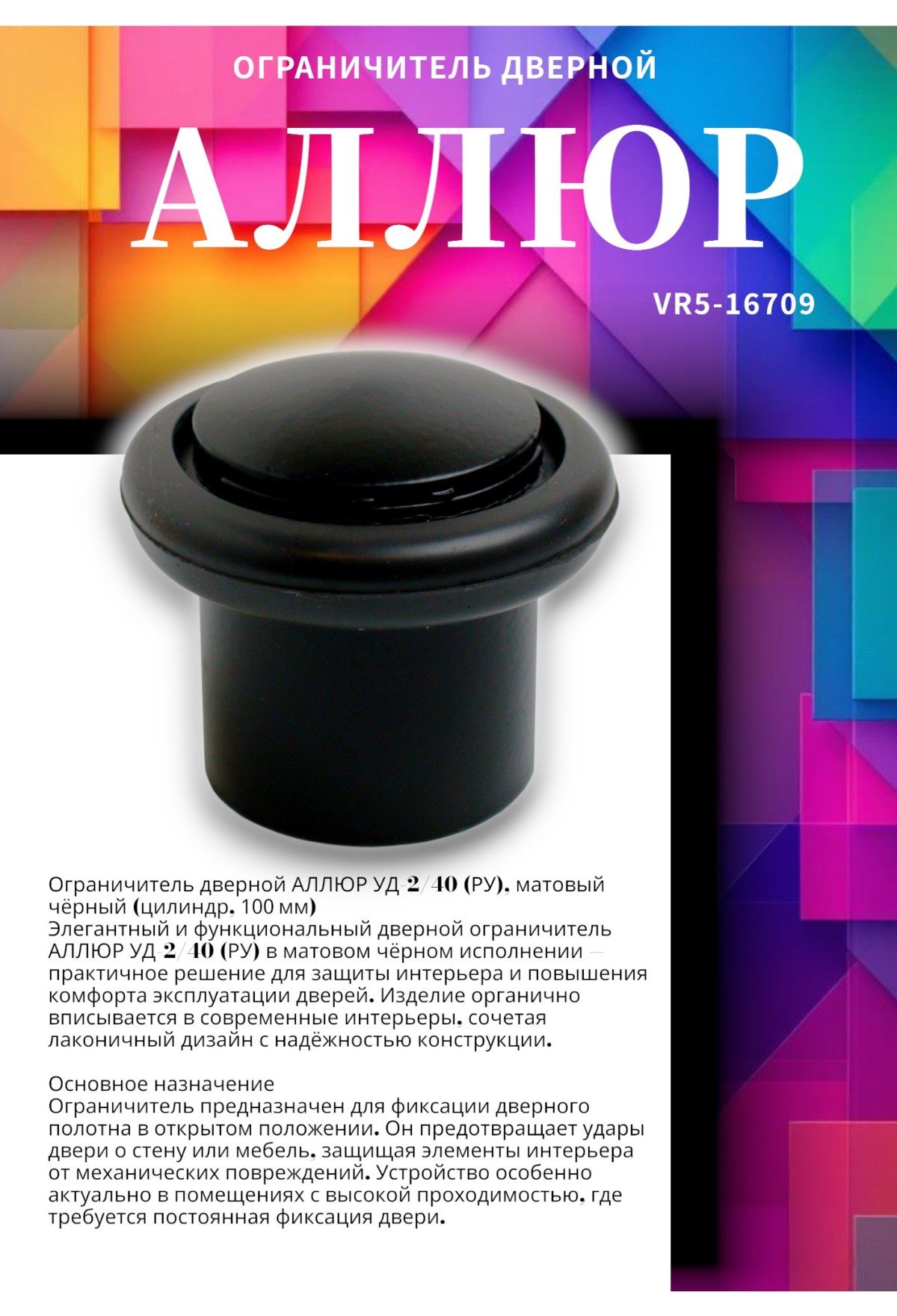 Стильный и функциональный дверной ограничитель Alliur УД‑240‑RU в матовом чёрном исполнении — современное решение для защиты стен и мебели от ударов дверью. Лаконичный дизайн и надёжная конструкция делают его удачным выбором для интерьеров любого стиля.