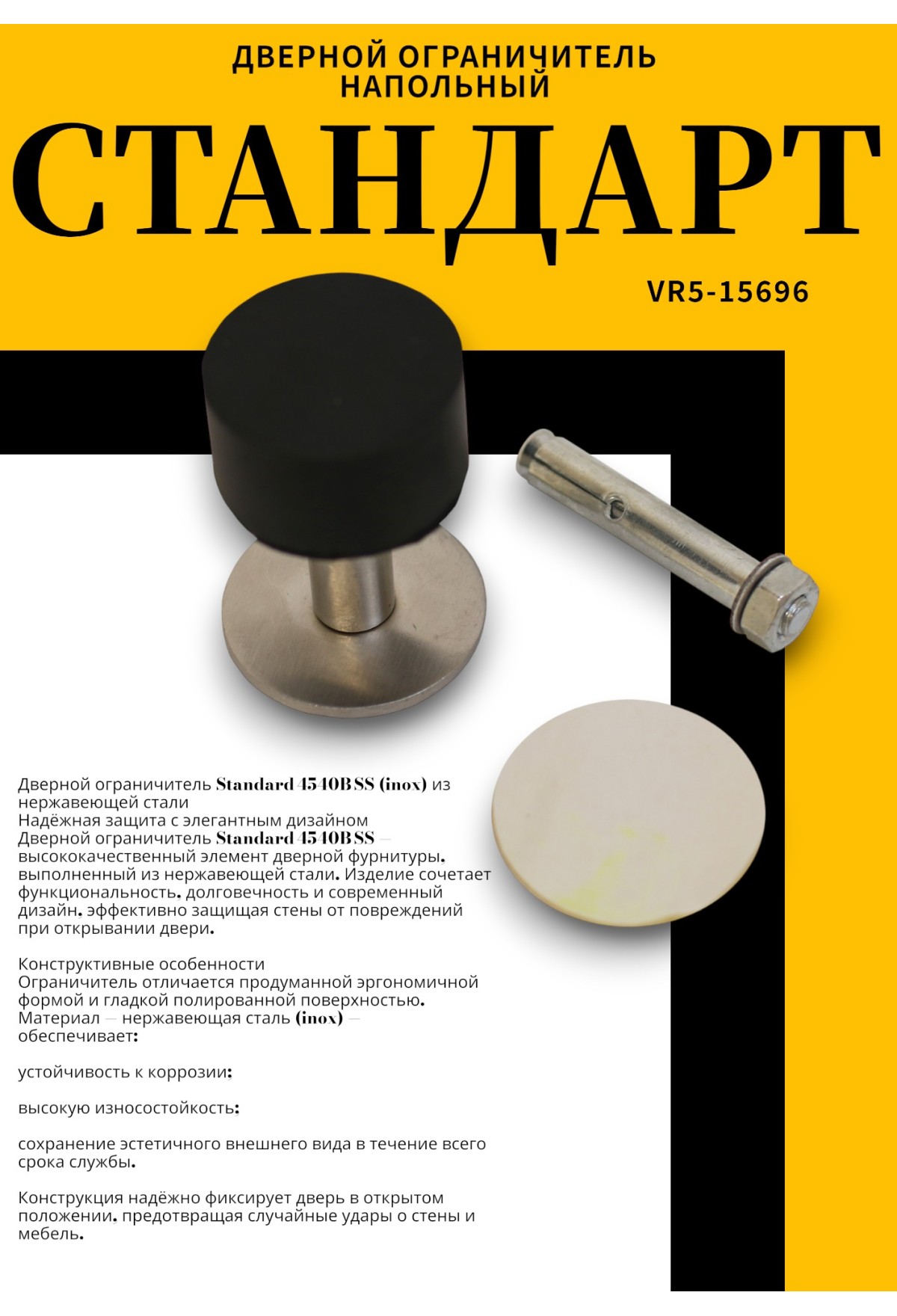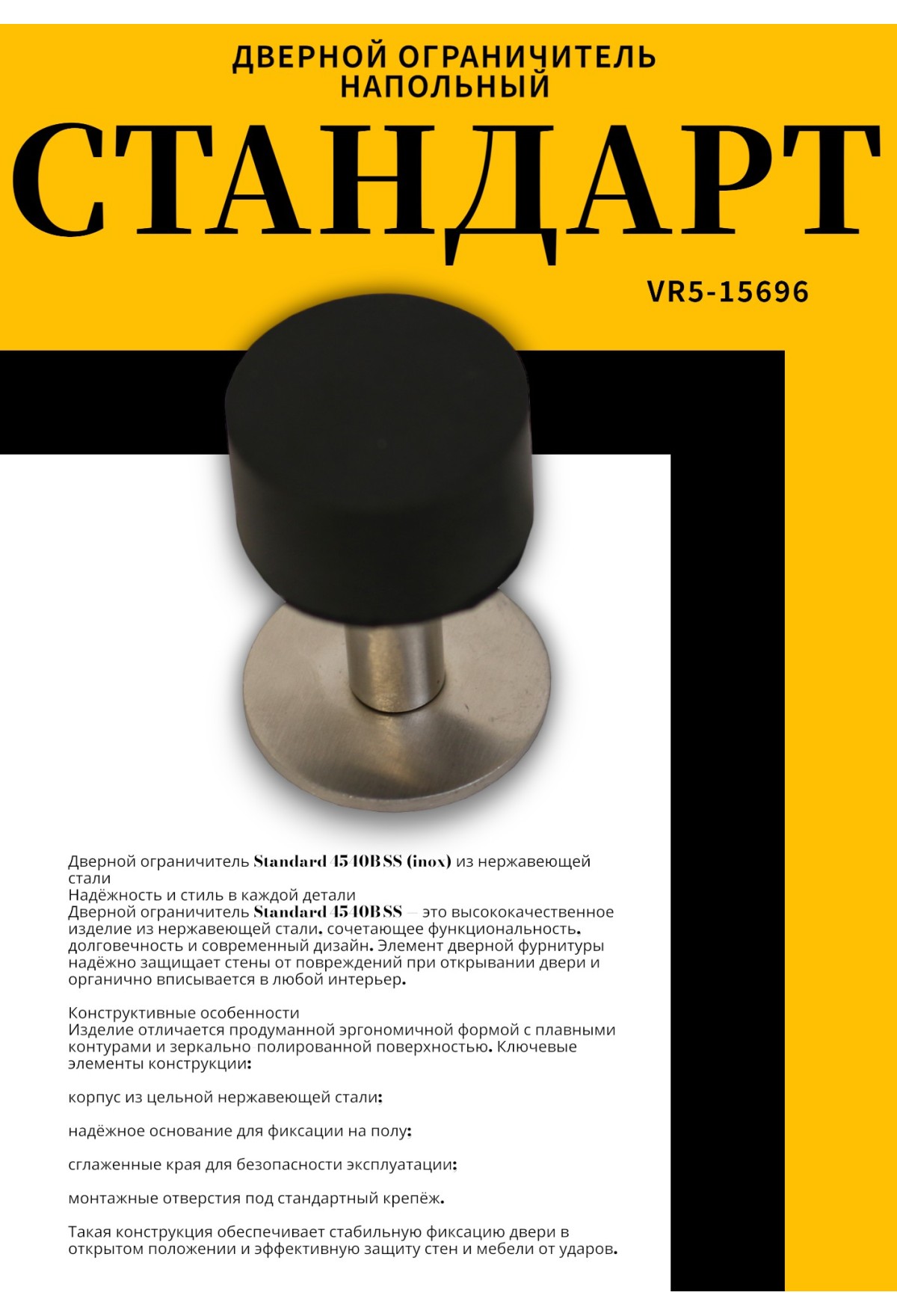 Дверной ограничитель Standard 4540B SS — высококачественный элемент дверной фурнитуры, выполненный из нержавеющей стали. Изделие сочетает функциональность, долговечность и современный дизайн, эффективно защищая стены от повреждений при открывании двери.