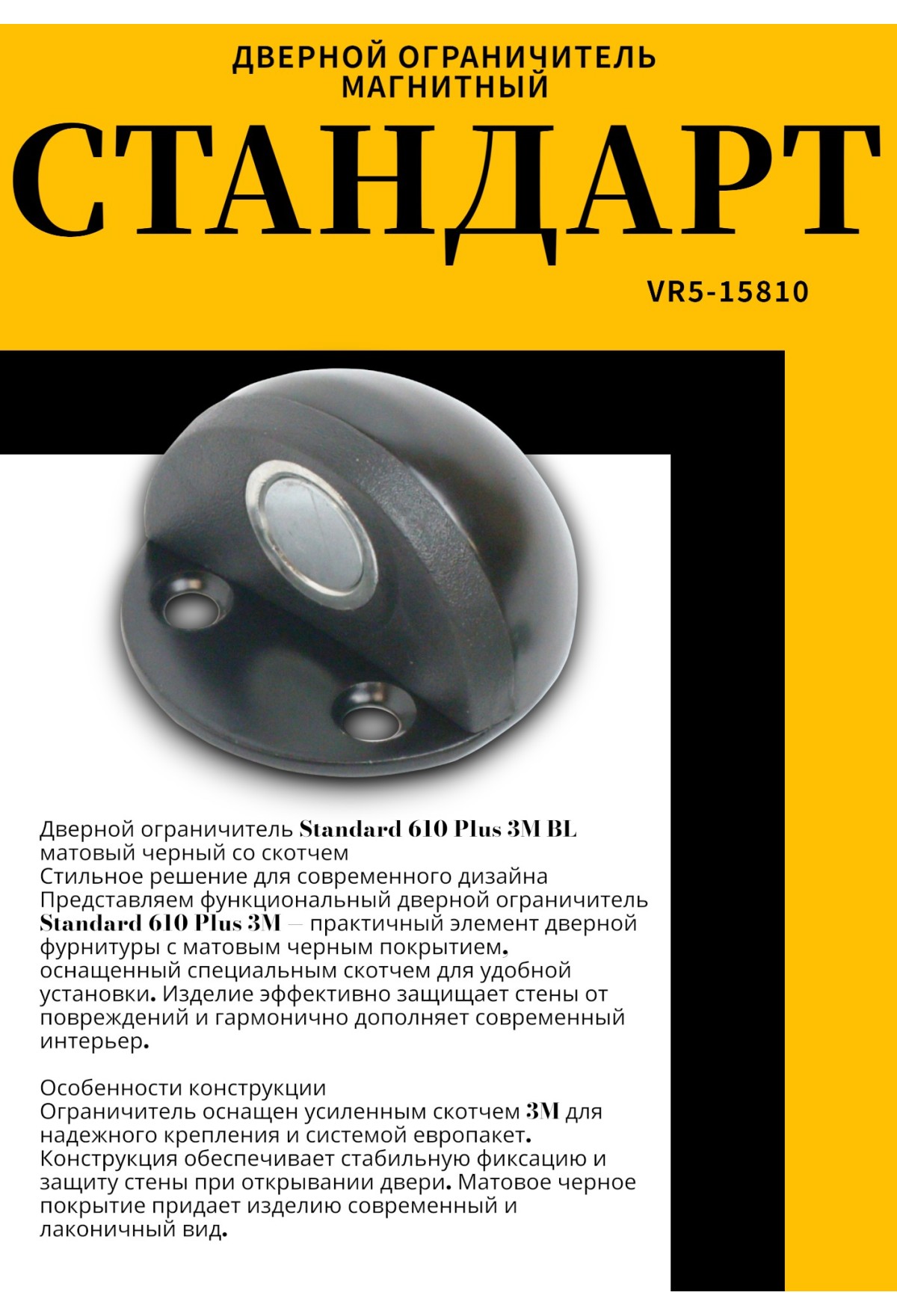 Представляем функциональный дверной ограничитель Standard 610 Plus 3M — практичный элемент дверной фурнитуры с матовым черным покрытием, оснащенный специальным скотчем для удобной установки. Изделие эффективно защищает стены от повреждений и гармонично дополняет современный интерьер.