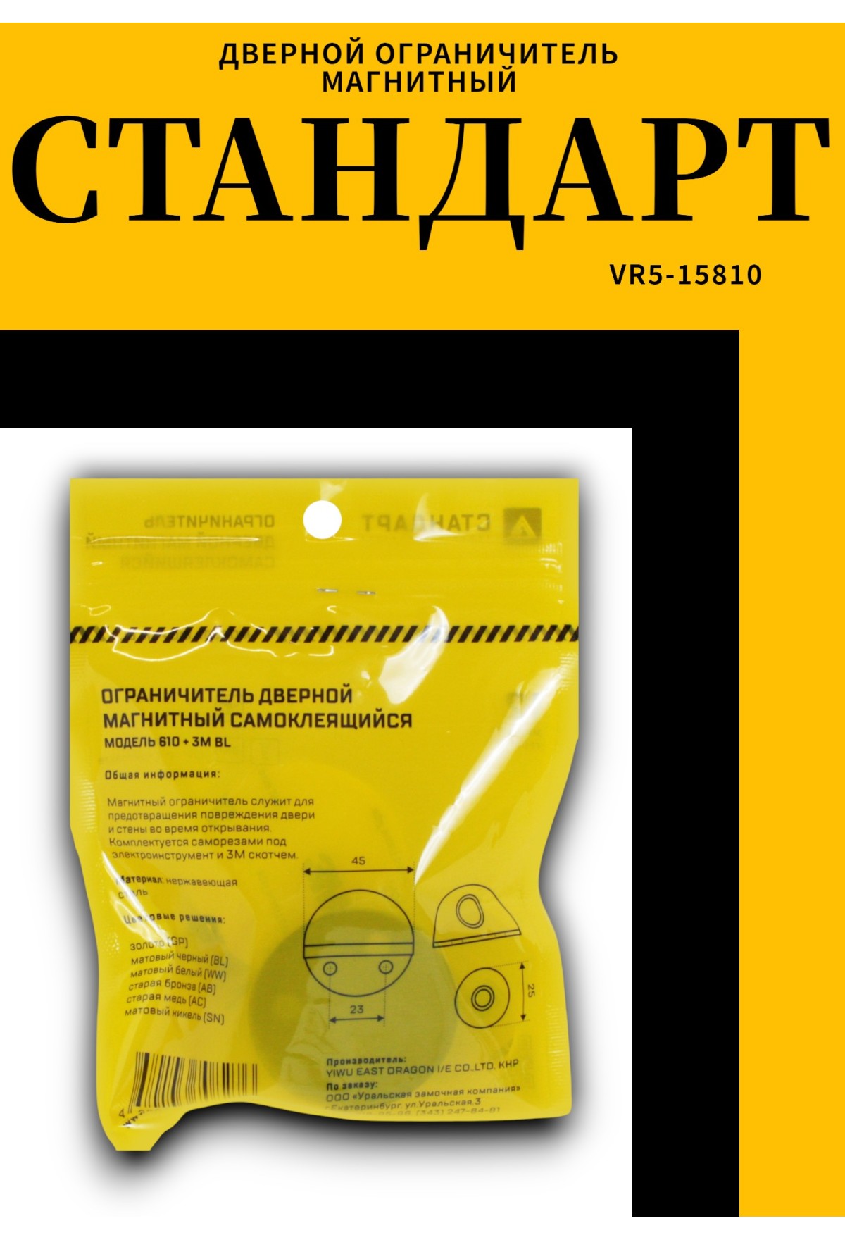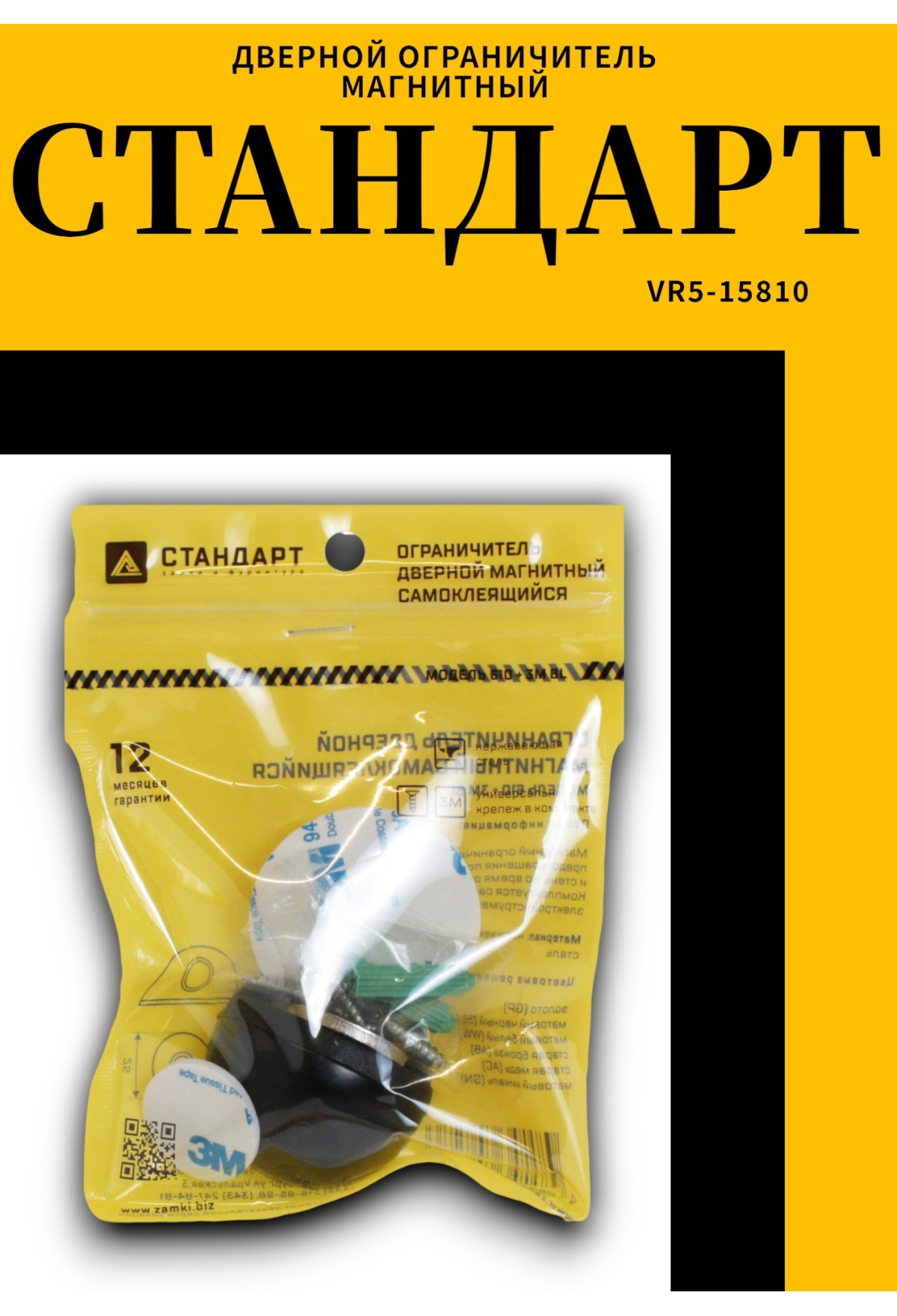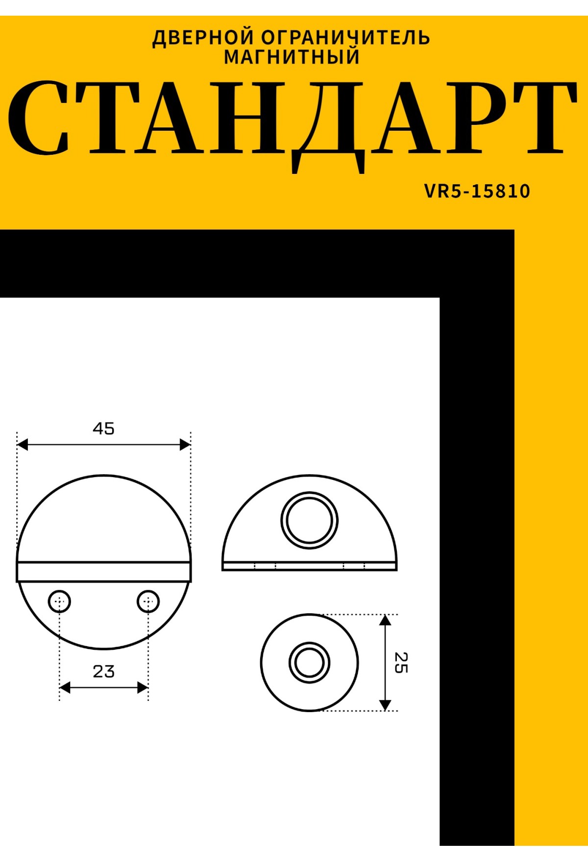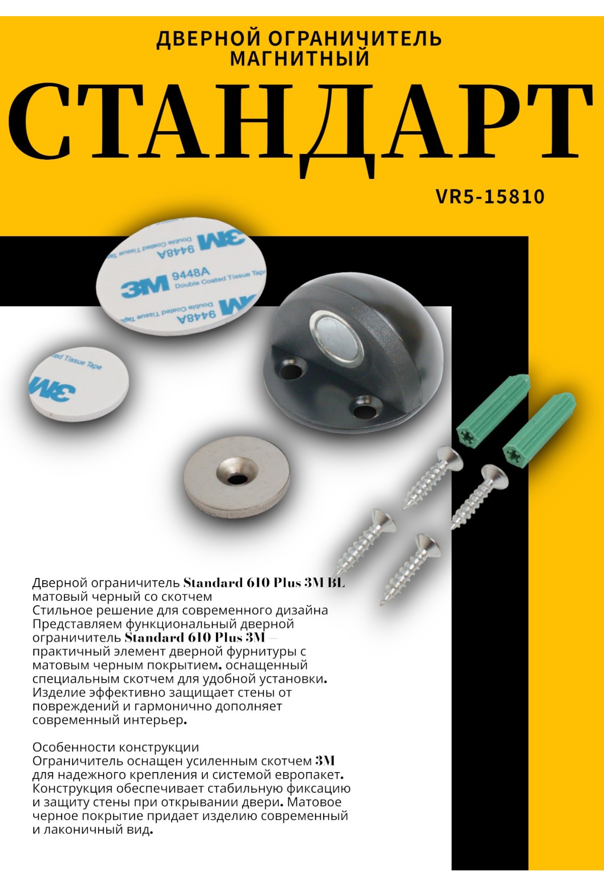 Ограничитель оснащен усиленным скотчем 3M для надежного крепления и системой европакет. Конструкция обеспечивает стабильную фиксацию и защиту стены при открывании двери. Матовое черное покрытие придает изделию современный и лаконичный вид.
