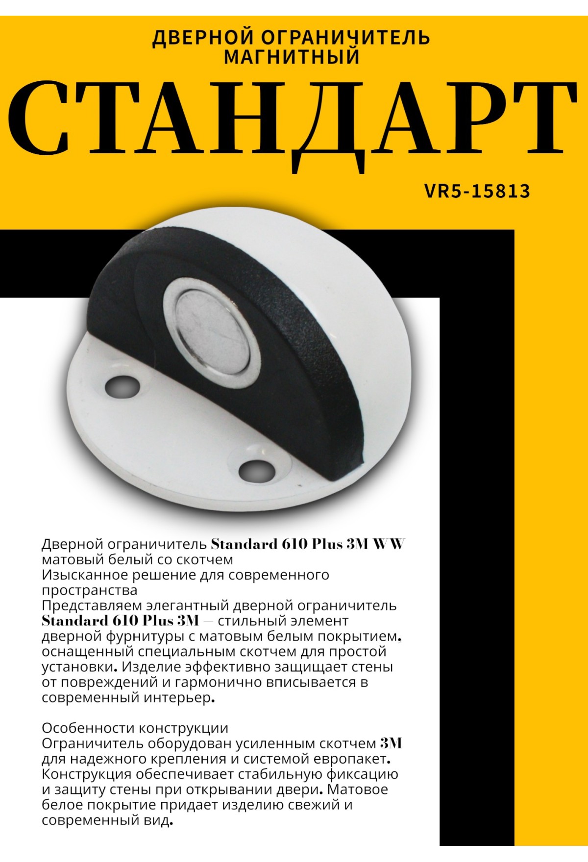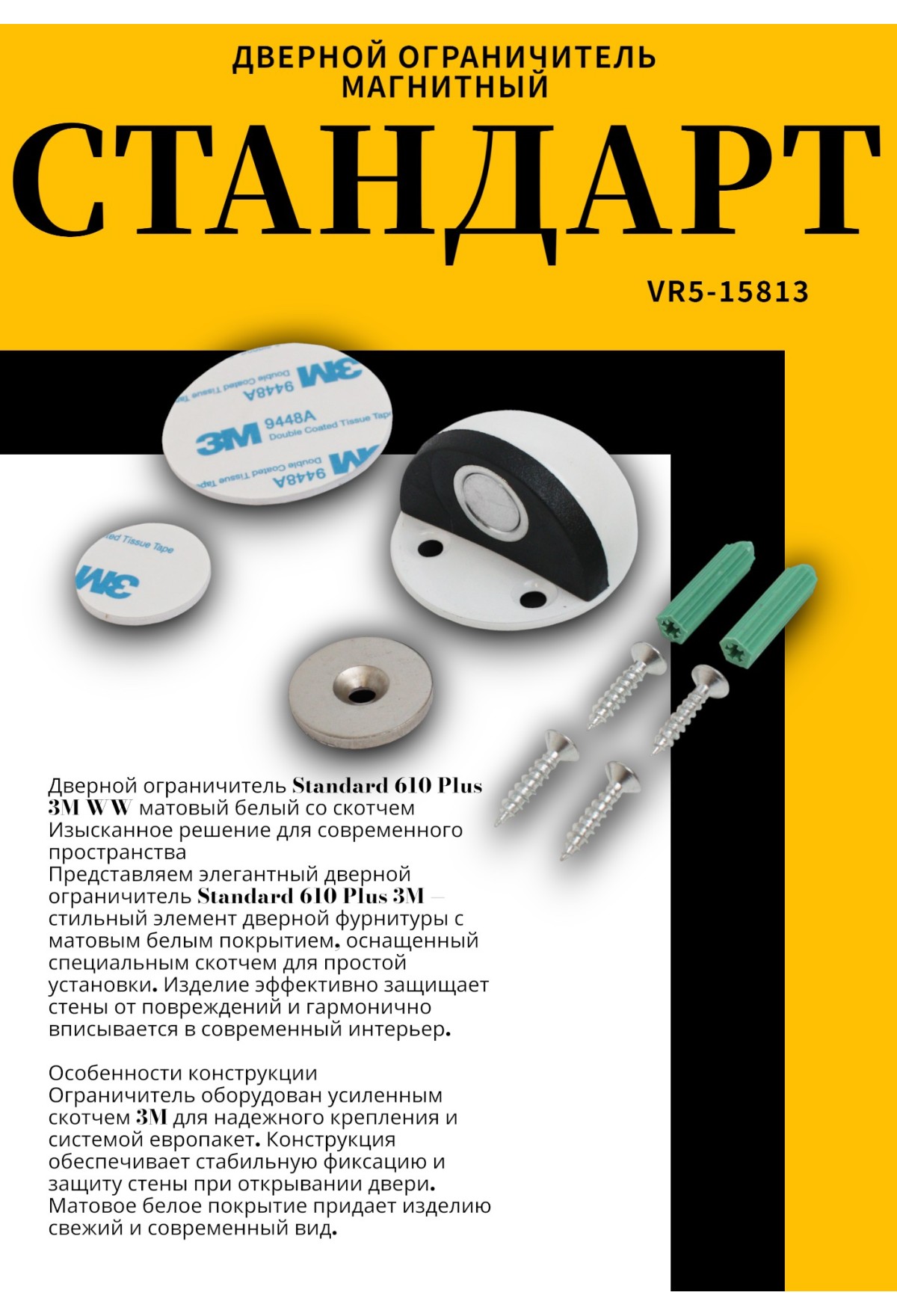 Представляем элегантный дверной ограничитель Standard 610 Plus 3M — стильный элемент дверной фурнитуры с матовым белым покрытием, оснащенный специальным скотчем для простой установки. Изделие эффективно защищает стены от повреждений и гармонично вписывается в современный интерьер.