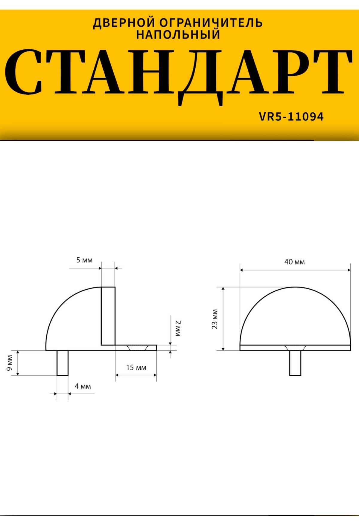 Ограничитель/упор дверной напольный. Материал - сплав ЦАМ, гальваническое покрытие, материал накладки - ПВХ. Имеет форму полусферы. Диаметр основания - 40мм. Крепеж в комплекте.