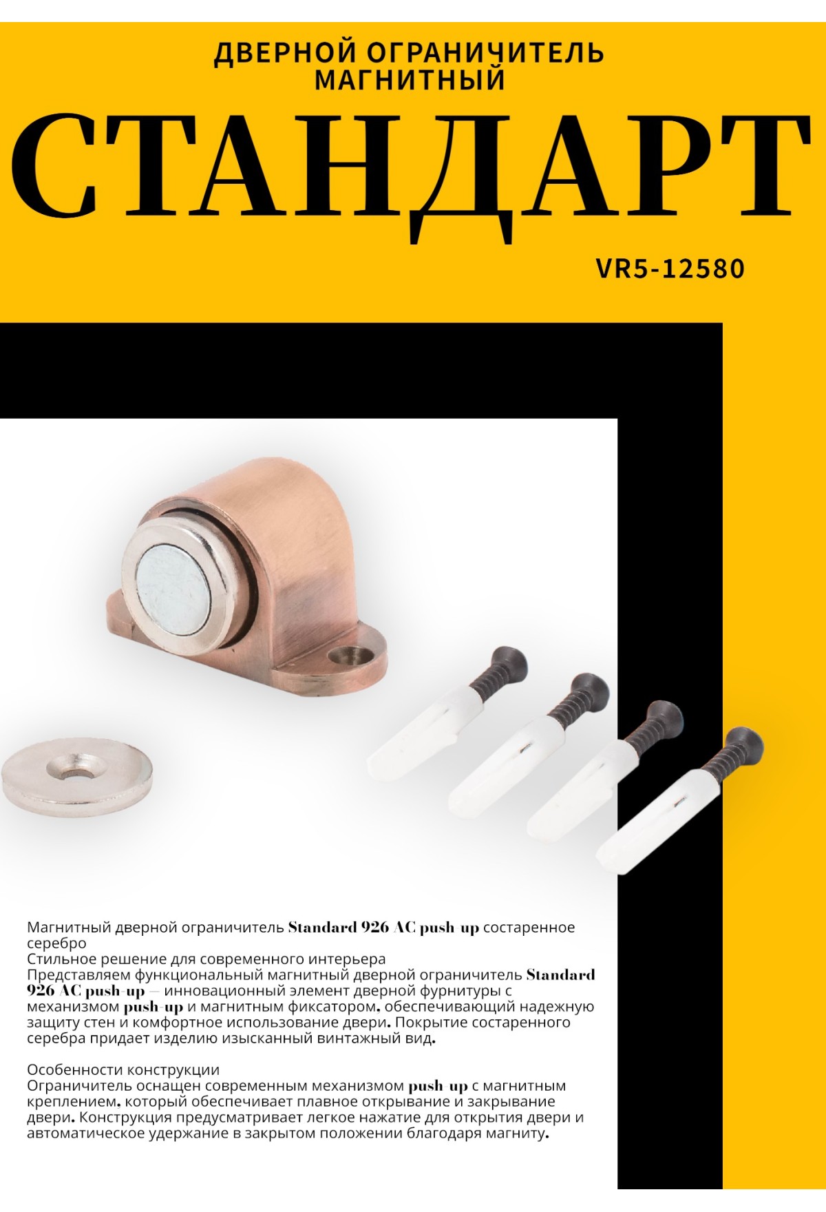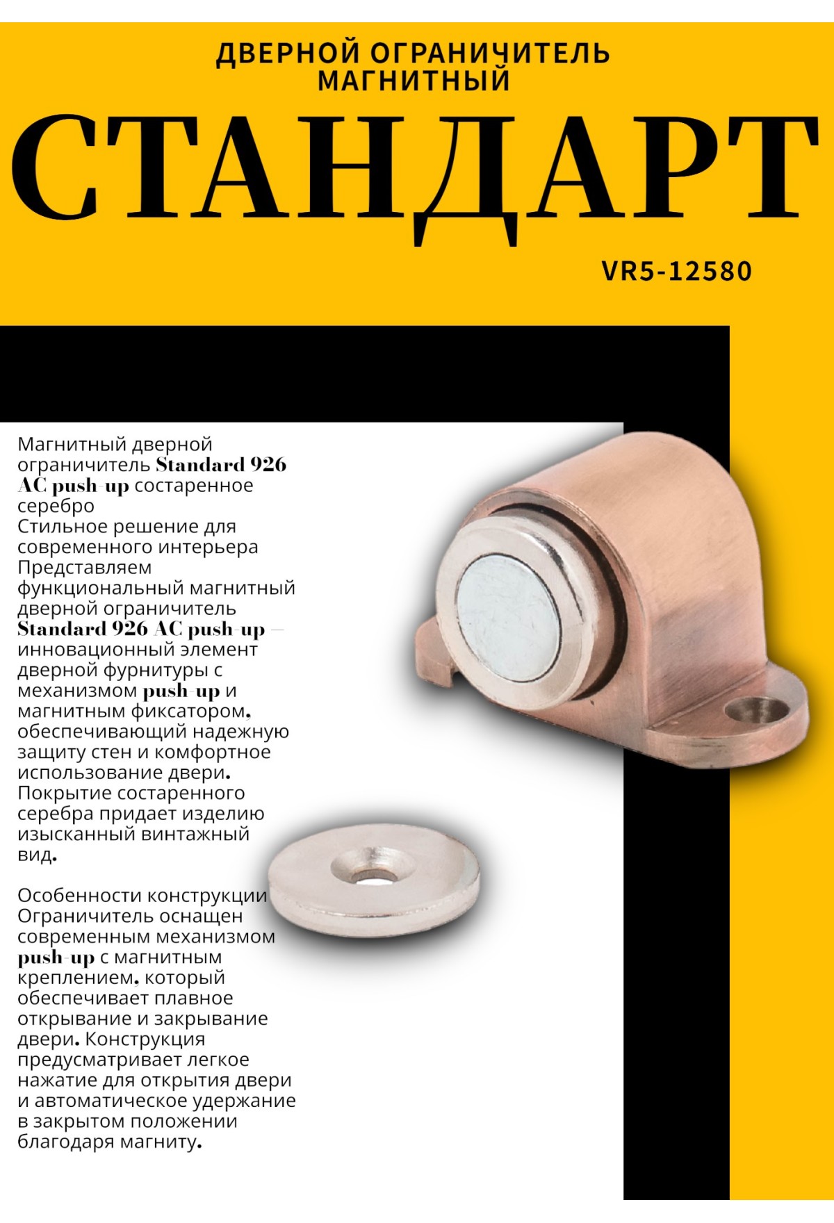 Представляем функциональный магнитный дверной ограничитель Standard 926 AC push-up — инновационный элемент дверной фурнитуры с механизмом push-up и магнитным фиксатором, обеспечивающий надежную защиту стен и комфортное использование двери. Покрытие состаренного серебра придает изделию изысканный винтажный вид.