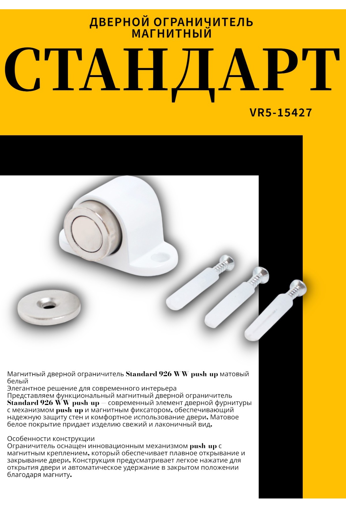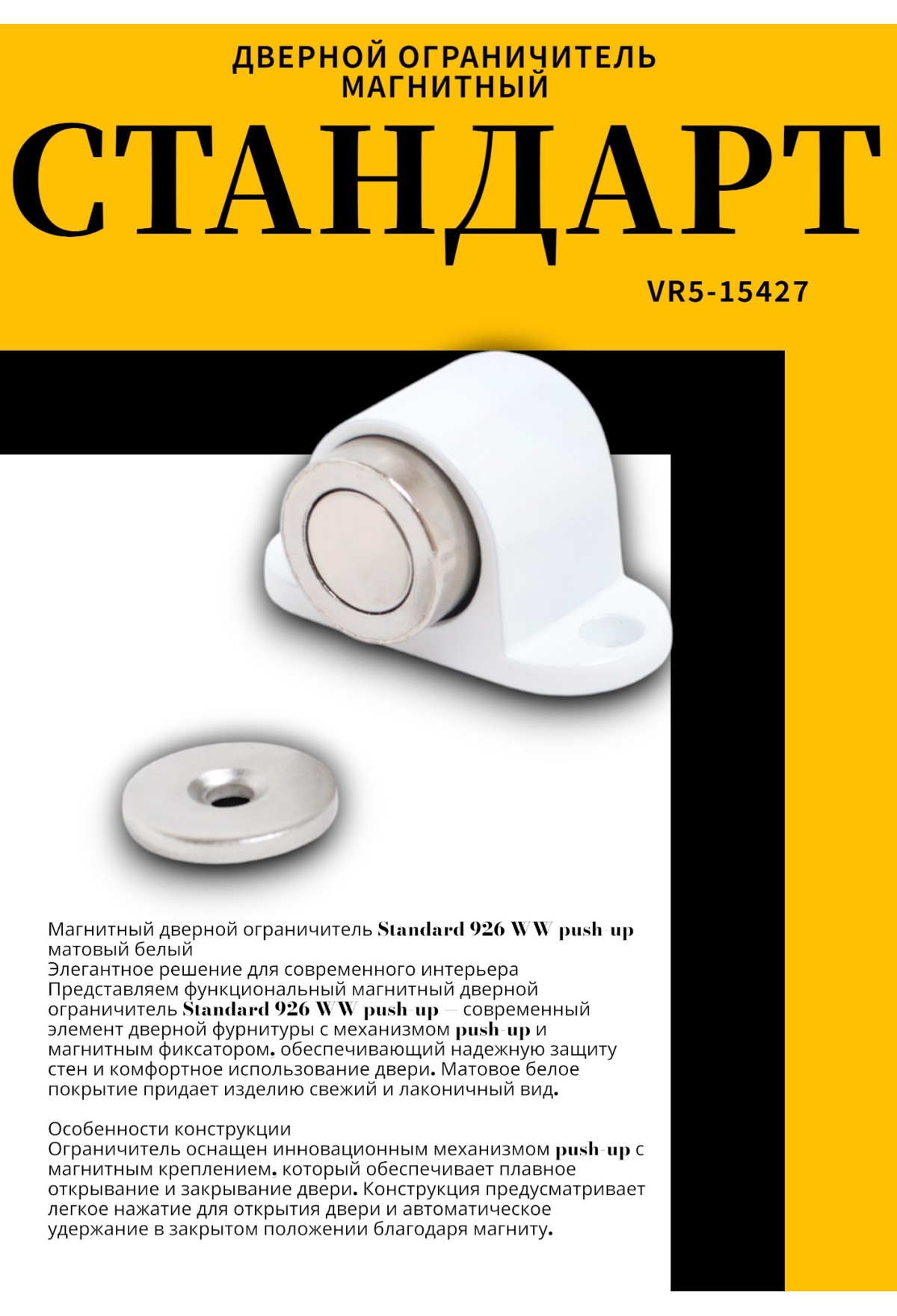 Представляем функциональный магнитный дверной ограничитель Standard 926 WW push-up — современный элемент дверной фурнитуры с механизмом push-up и магнитным фиксатором, обеспечивающий надежную защиту стен и комфортное использование двери. Матовое белое покрытие придает изделию свежий и лаконичный вид.