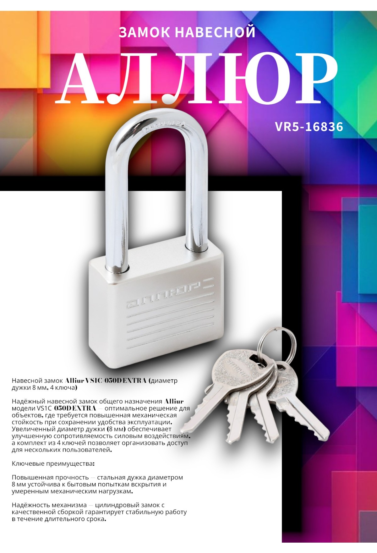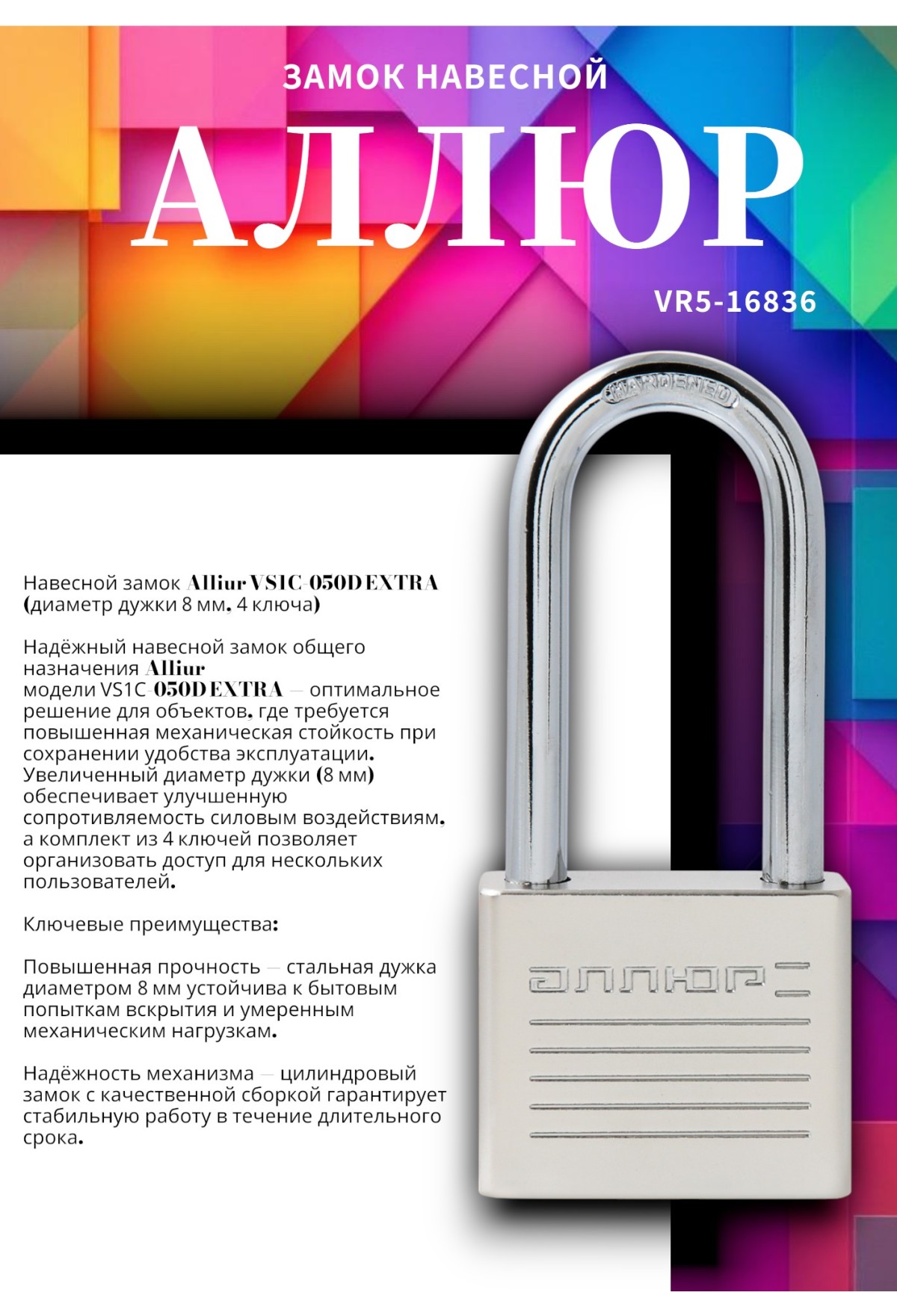 Надёжный навесной замок общего назначения Alliur модели VS1C‑050D EXTRA — оптимальное решение для объектов, где требуется повышенная механическая стойкость при сохранении удобства эксплуатации. Увеличенный диаметр дужки (8 мм) обеспечивает улучшенную сопротивляемость силовым воздействиям, а комплект из 4 ключей позволяет организовать доступ для нескольких пользователей.
