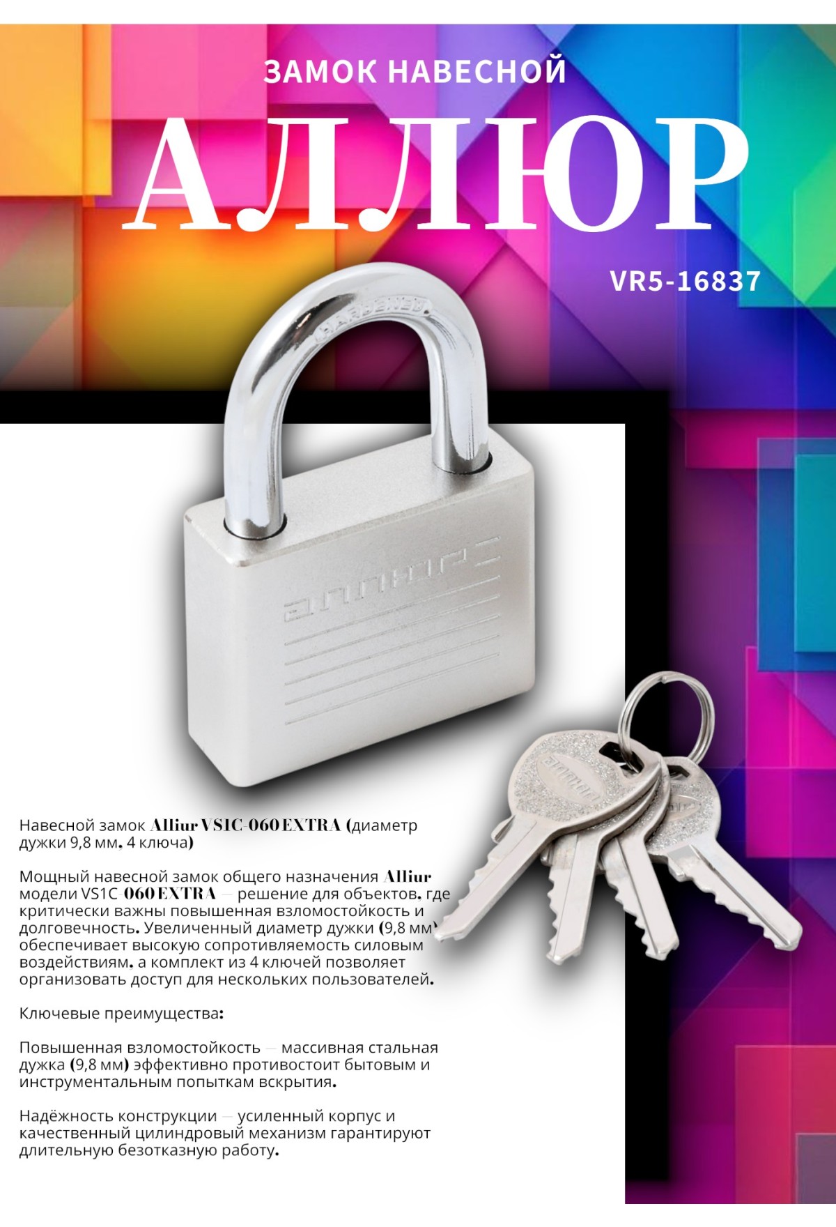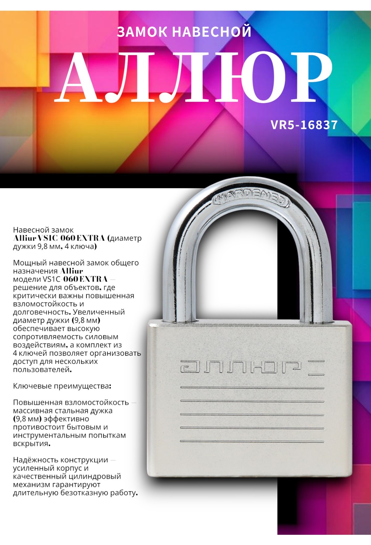 Технические характеристики АЛЛЮР ВС1Ч-060 EXTRA d9,8мм 4кл. Замок навесной (48,12)