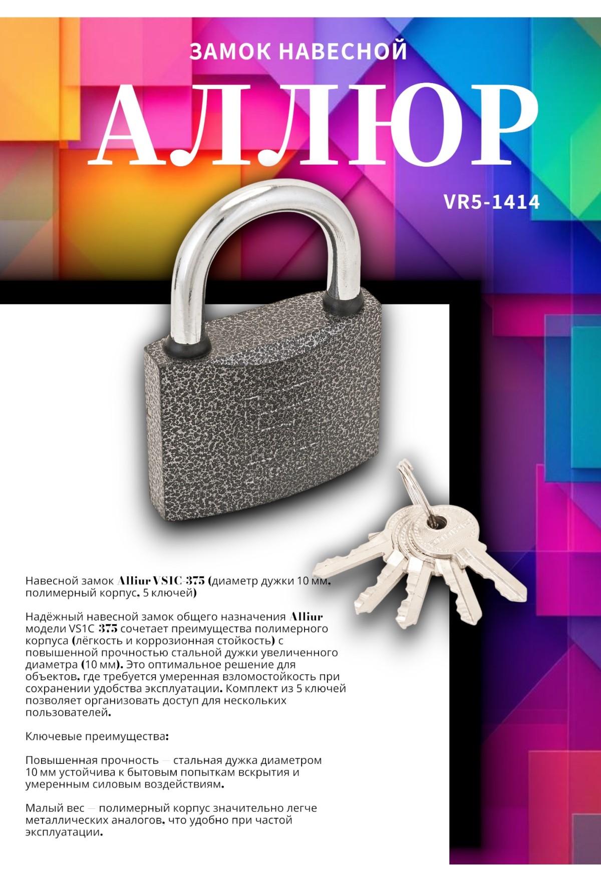 Навесной замок Alliur VS1C‑375 (диаметр дужки 10 мм, полимерный корпус, 5 ключей)
