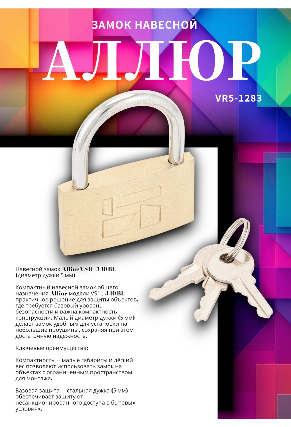 Компактный навесной замок общего назначения Alliur модели VS1L‑340 BL — практичное решение для защиты объектов, где требуется базовый уровень безопасности и важна компактность конструкции. Малый диаметр дужки (5 мм) делает замок удобным для установки на небольшие проушины, сохраняя при этом достаточную надёжность.
