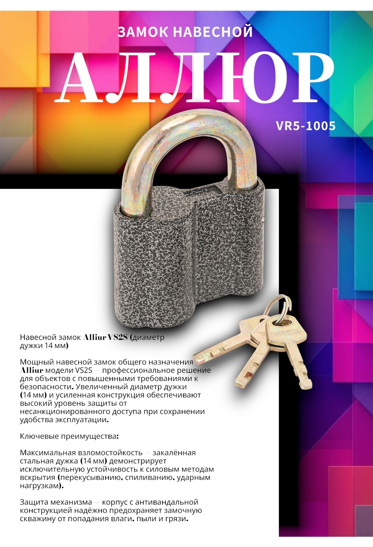 Мощный навесной замок общего назначения Alliur модели VS2S — профессиональное решение для объектов с повышенными требованиями к безопасности. Увеличенный диаметр дужки (14 мм) и усиленная конструкция обеспечивают высокий уровень защиты от несанкционированного доступа при сохранении удобства эксплуатации.