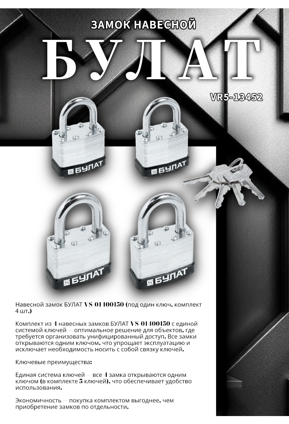 Комплект из 4 навесных замков БУЛАТ VS‑01400150 с единой системой ключей — оптимальное решение для объектов, где требуется организовать унифицированный доступ. Все замки открываются одним ключом, что упрощает эксплуатацию и исключает необходимость носить с собой связку ключей.