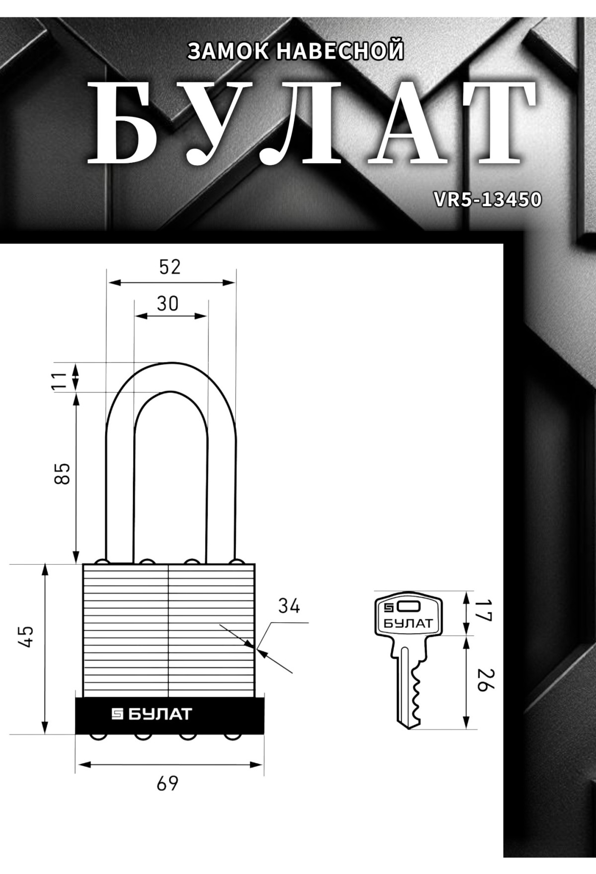 Навесной замок БУЛАТ VS‑0165‑01 (стальной, диаметр дужки 11 мм)