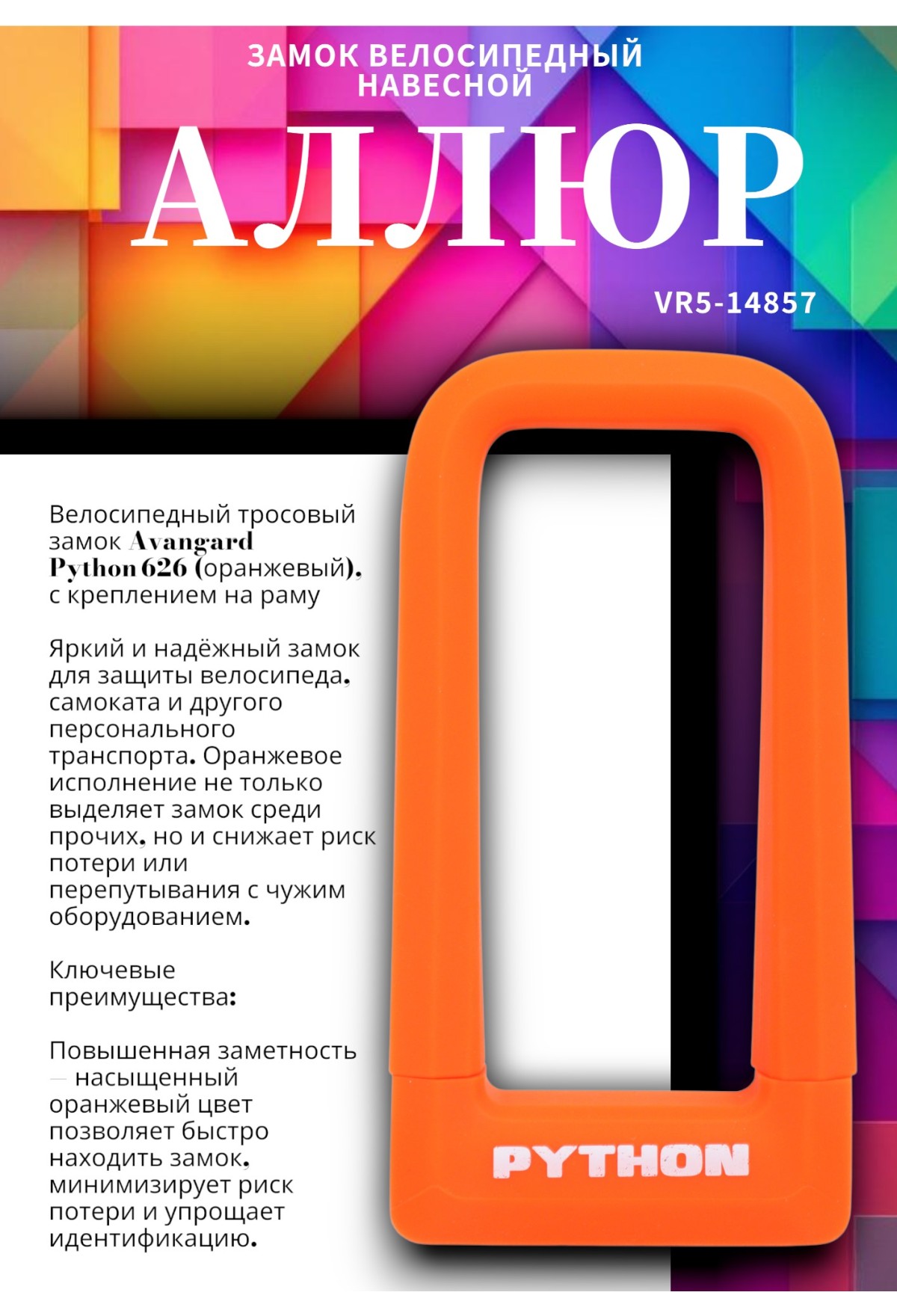 Яркий и надёжный замок для защиты велосипеда, самоката и другого персонального транспорта. Оранжевое исполнение не только выделяет замок среди прочих, но и снижает риск потери или перепутывания с чужим оборудованием.