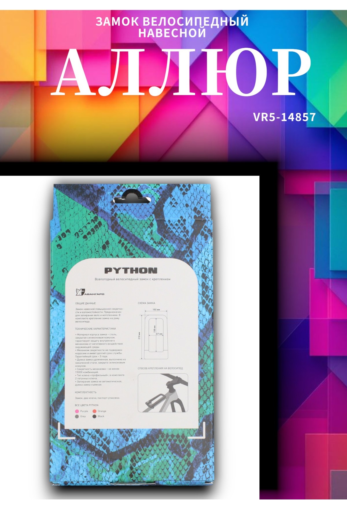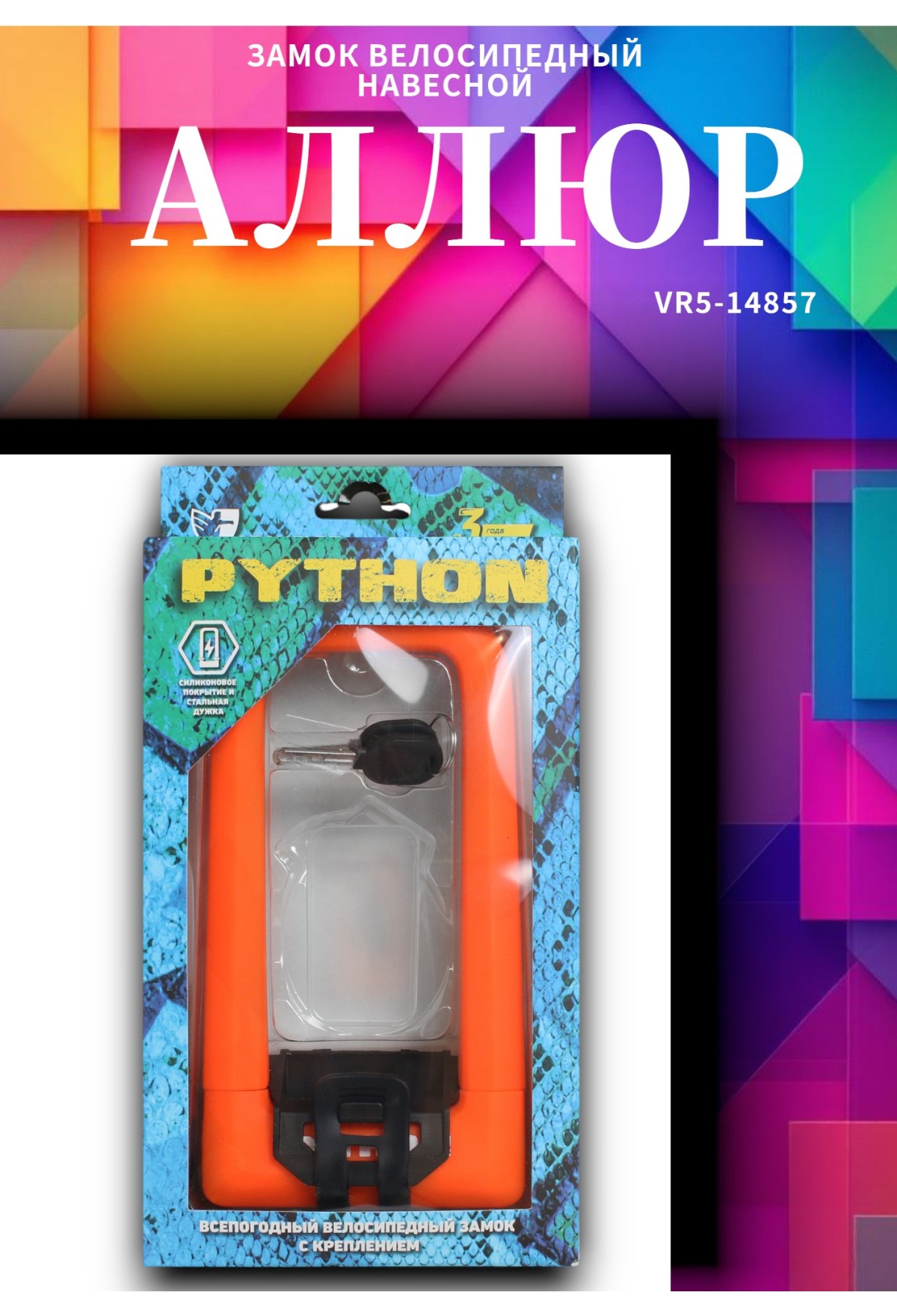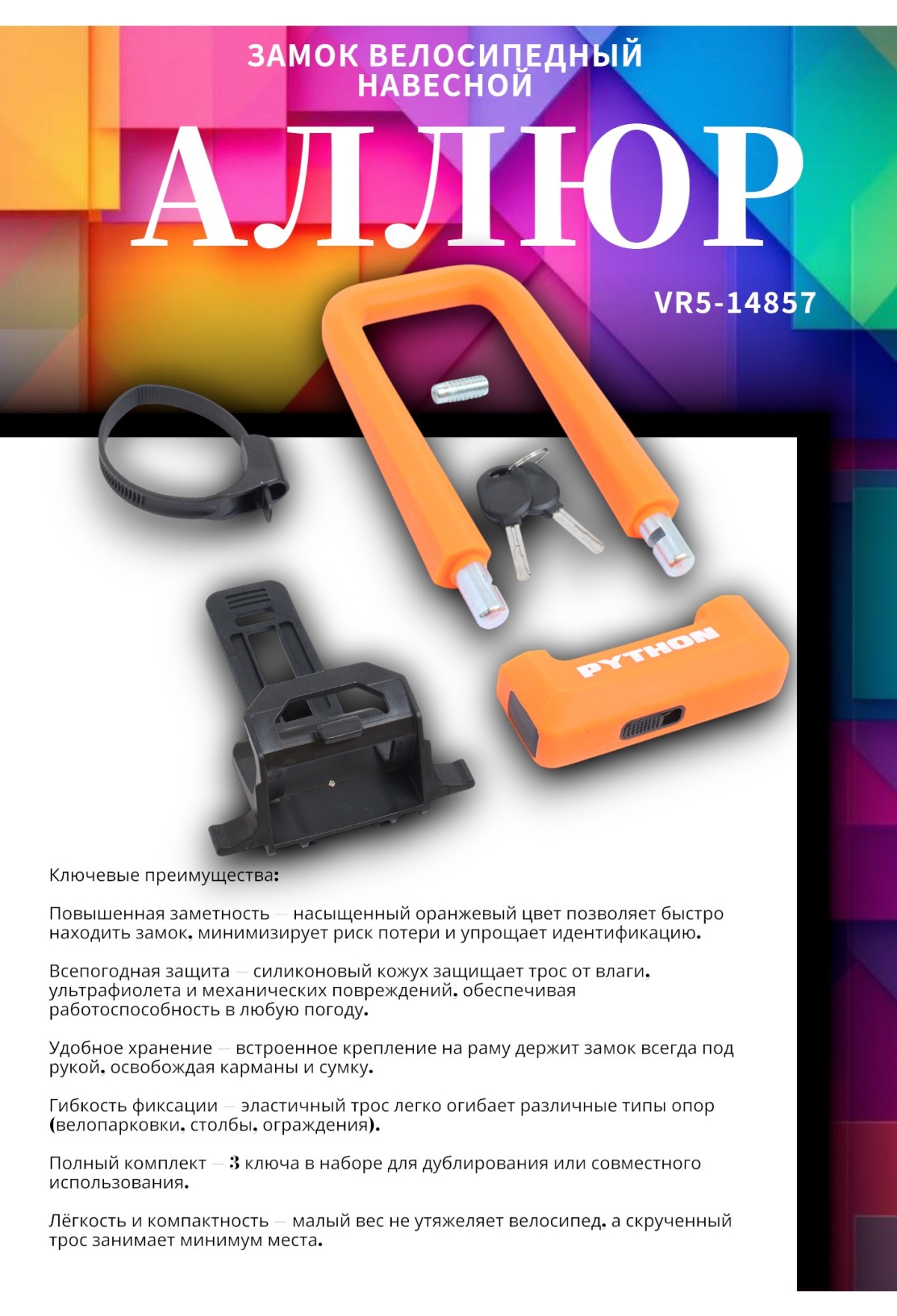 Комплектация: замок, крепление на раму, 3 ключа, упаковка.