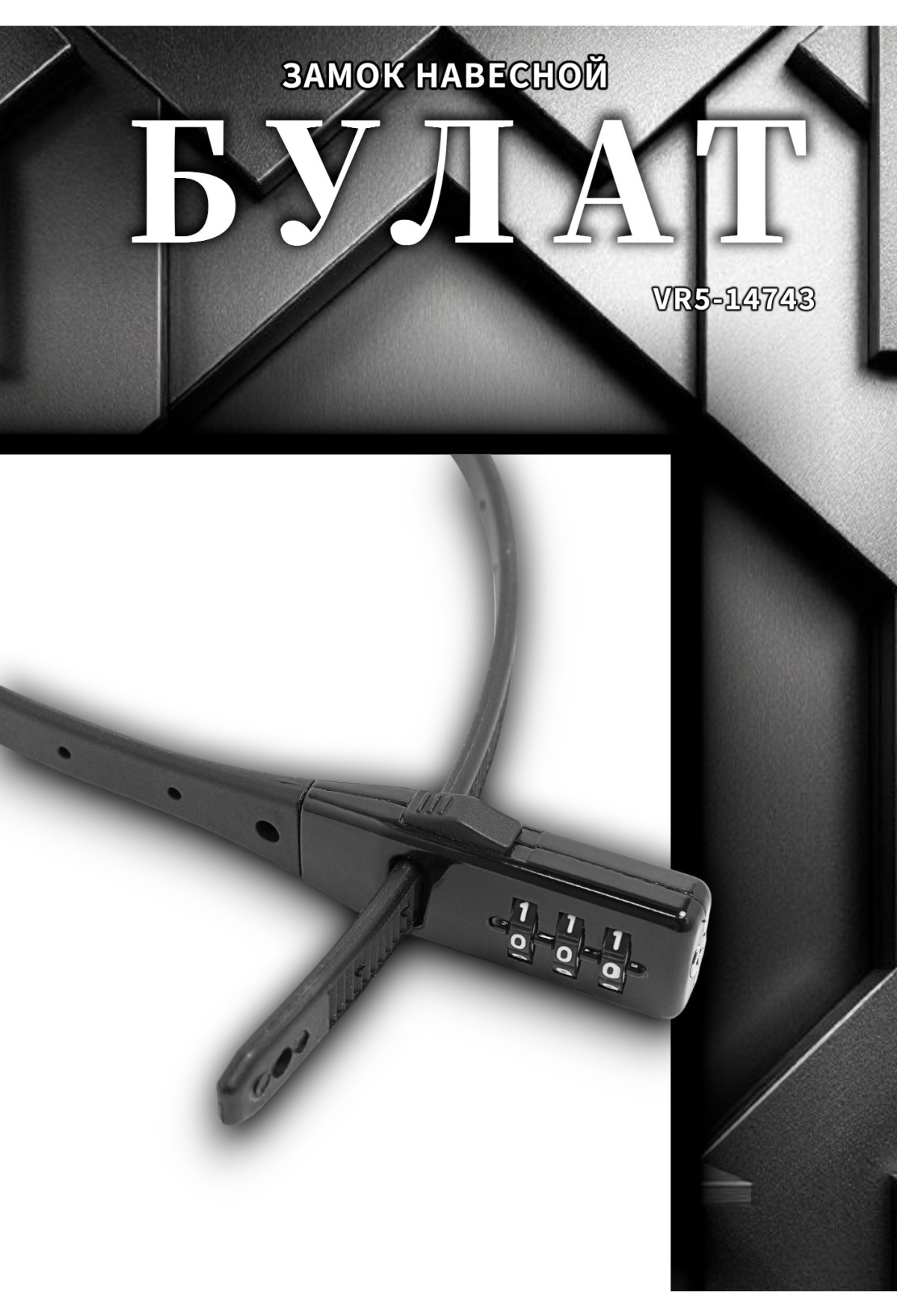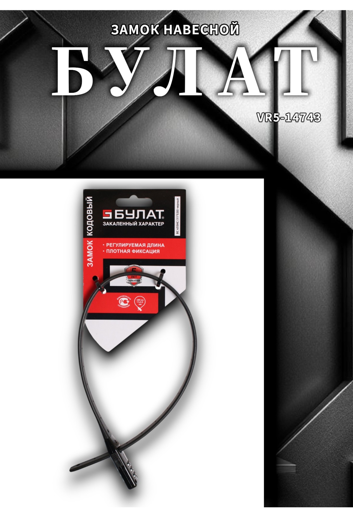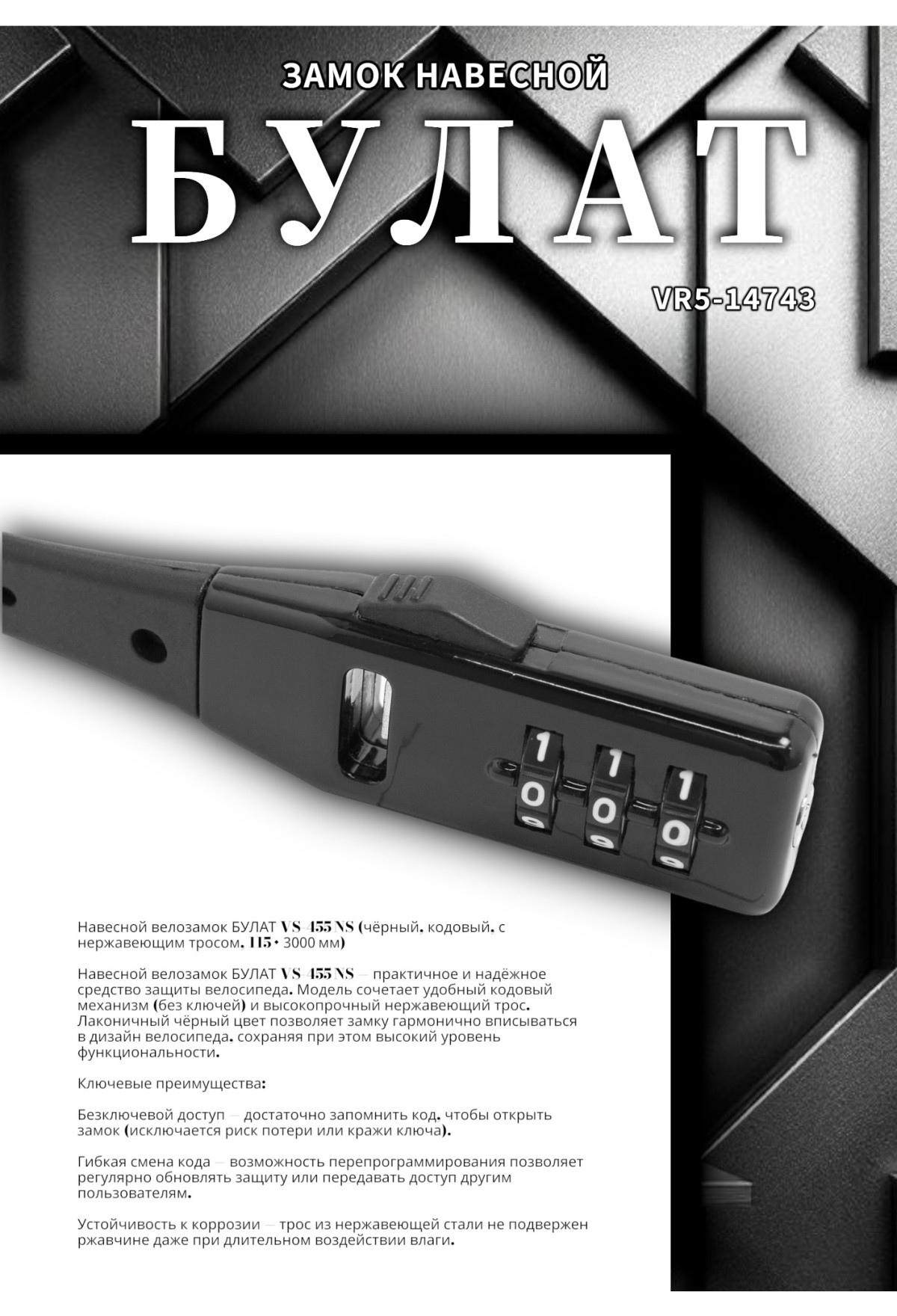 Навесной велозамок БУЛАТ VS‑455 NS (чёрный, кодовый, с нержавеющим тросом, 115 × 3000 мм)