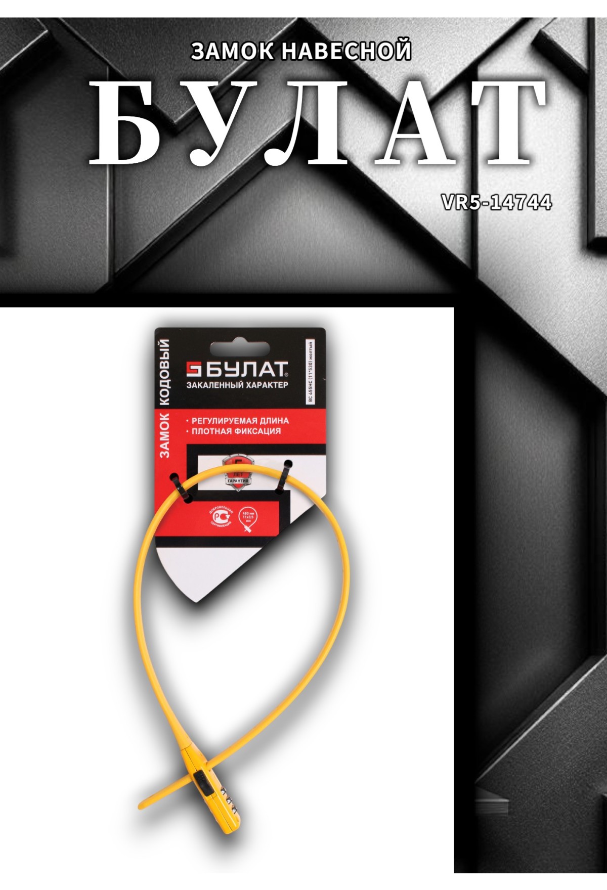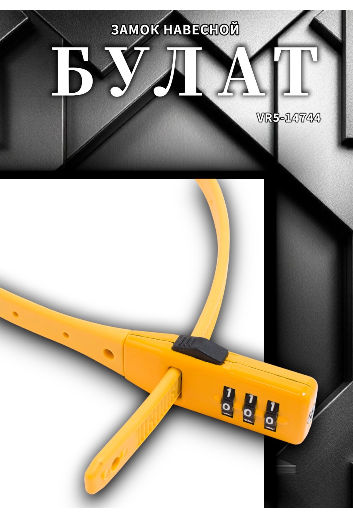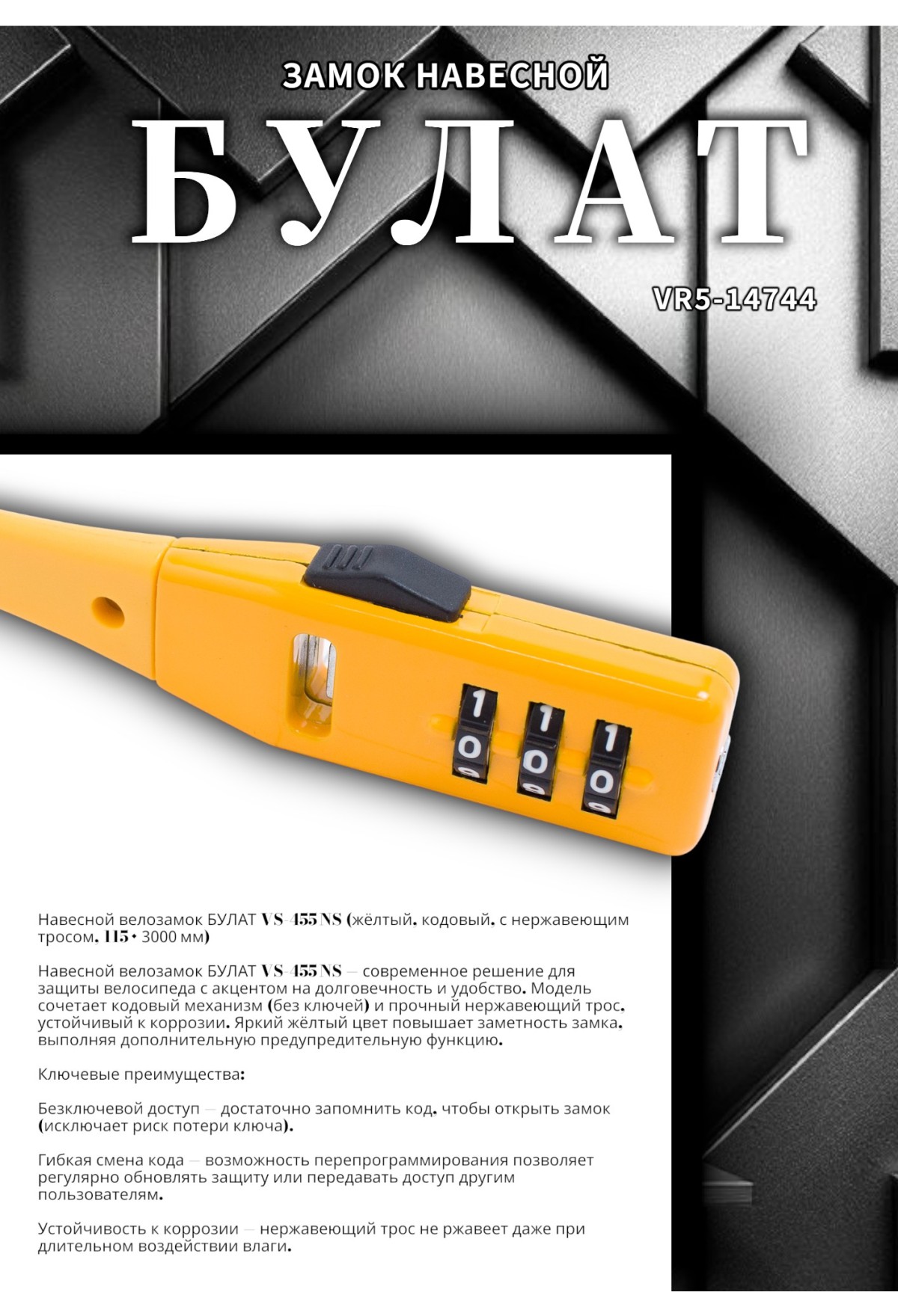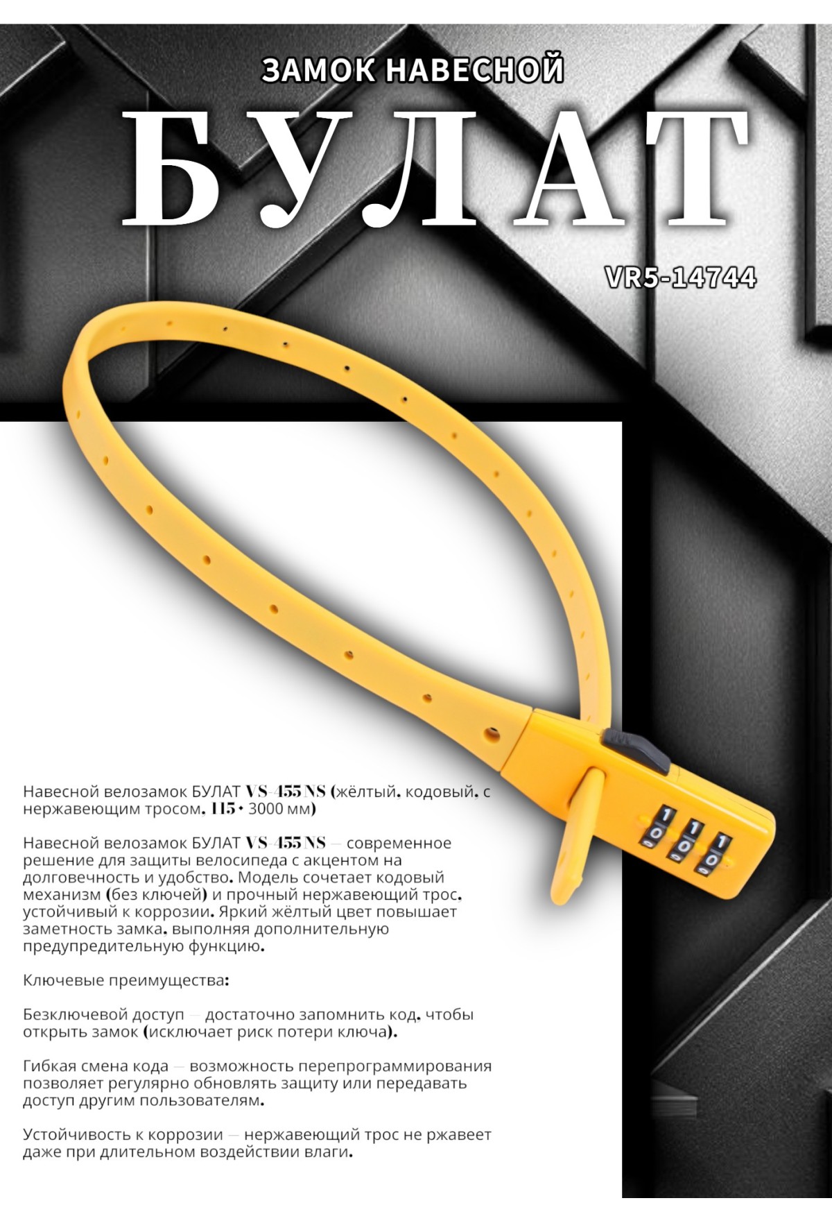 Навесной велозамок БУЛАТ VS‑455 NS (жёлтый, кодовый, с нержавеющим тросом, 115 × 3000 мм)