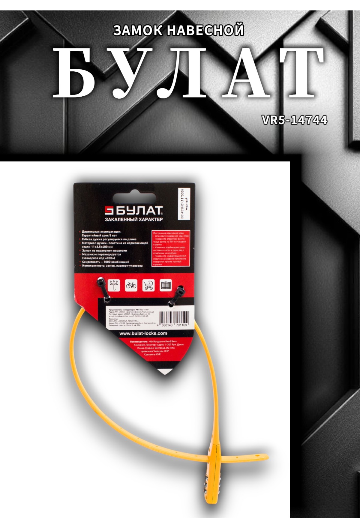 Навесной велозамок БУЛАТ VS‑455 NS — современное решение для защиты велосипеда с акцентом на долговечность и удобство. Модель сочетает кодовый механизм (без ключей) и прочный нержавеющий трос, устойчивый к коррозии. Яркий жёлтый цвет повышает заметность замка, выполняя дополнительную предупредительную функцию.