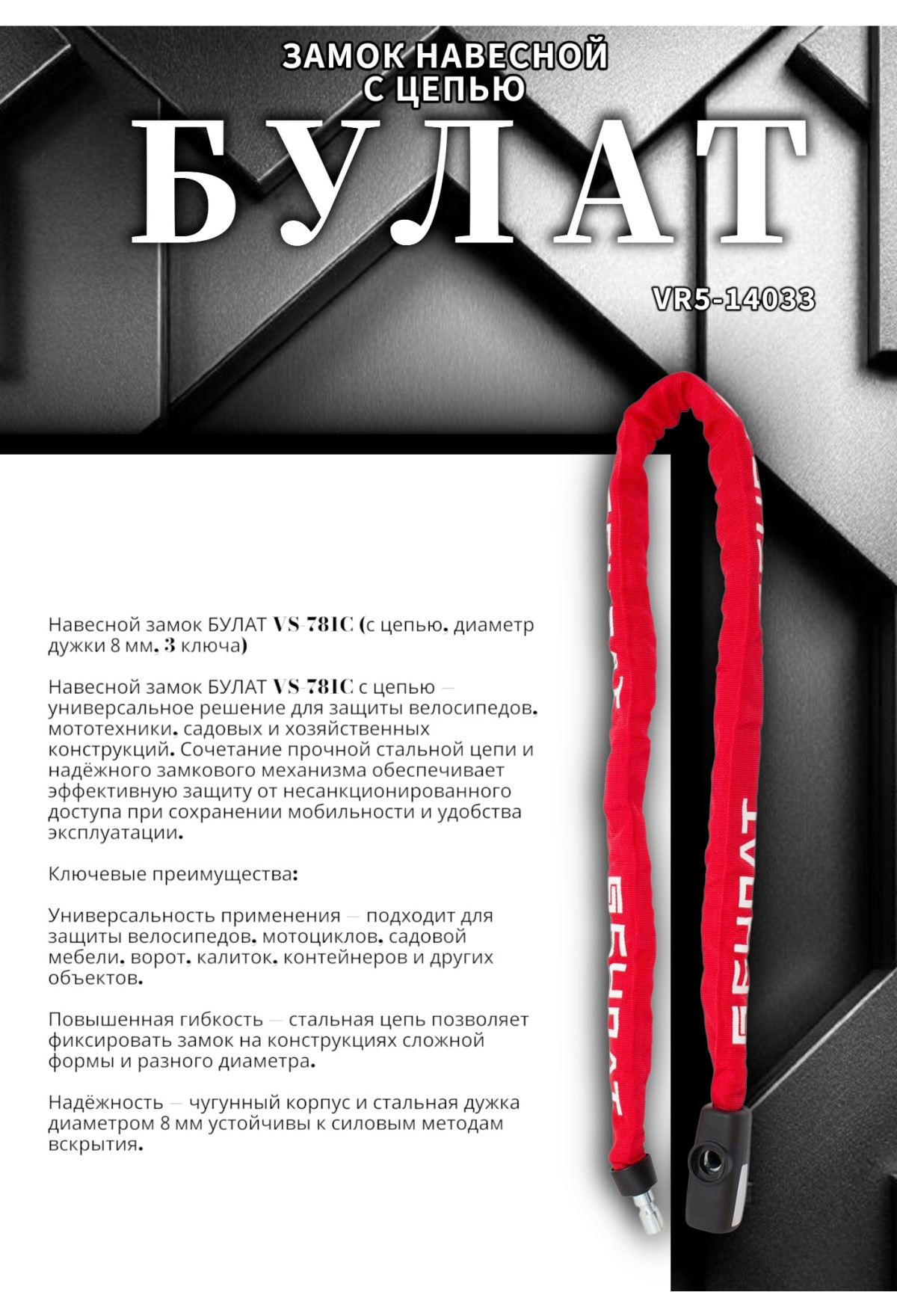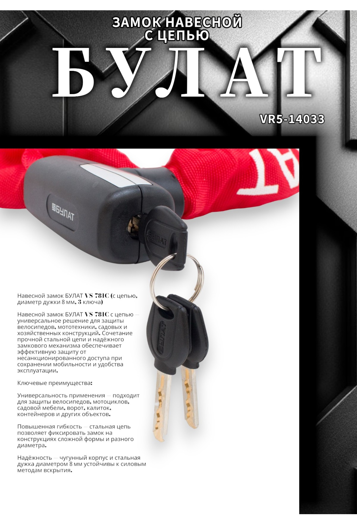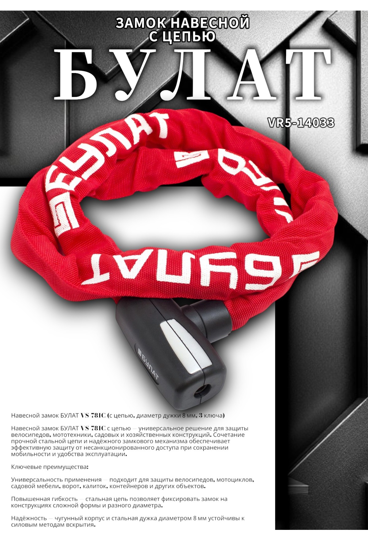 Навесной замок БУЛАТ VS‑781C (с цепью, диаметр дужки 8 мм, 3 ключа)