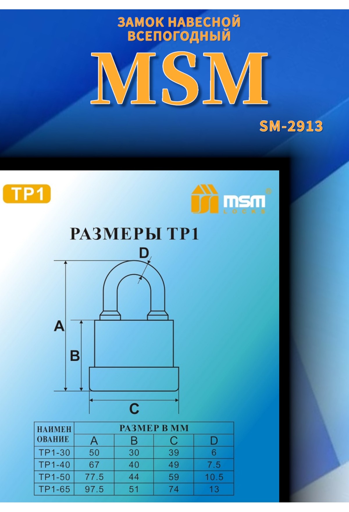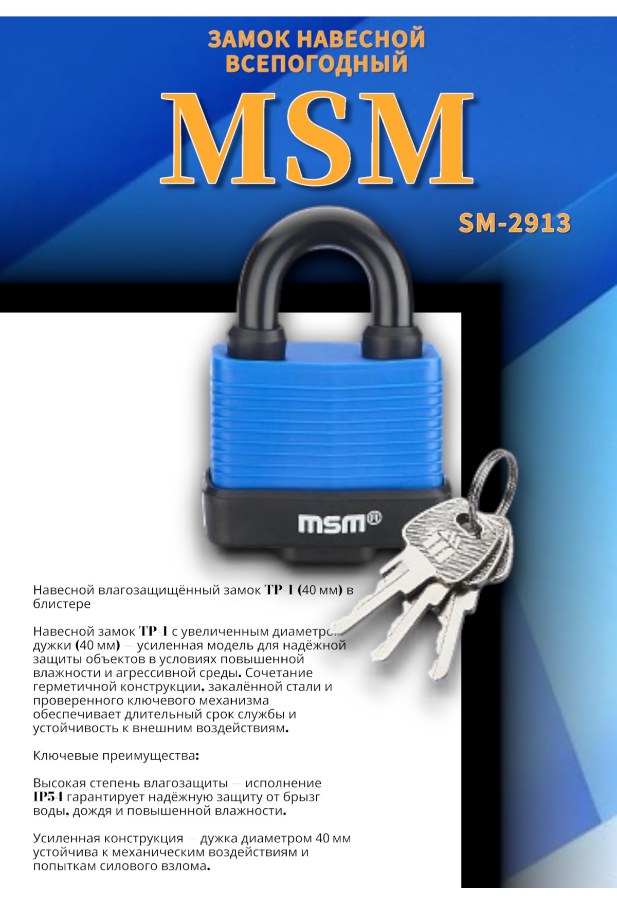 Навесной влагозащищённый замок TP‑1 (40 мм) в блистере
