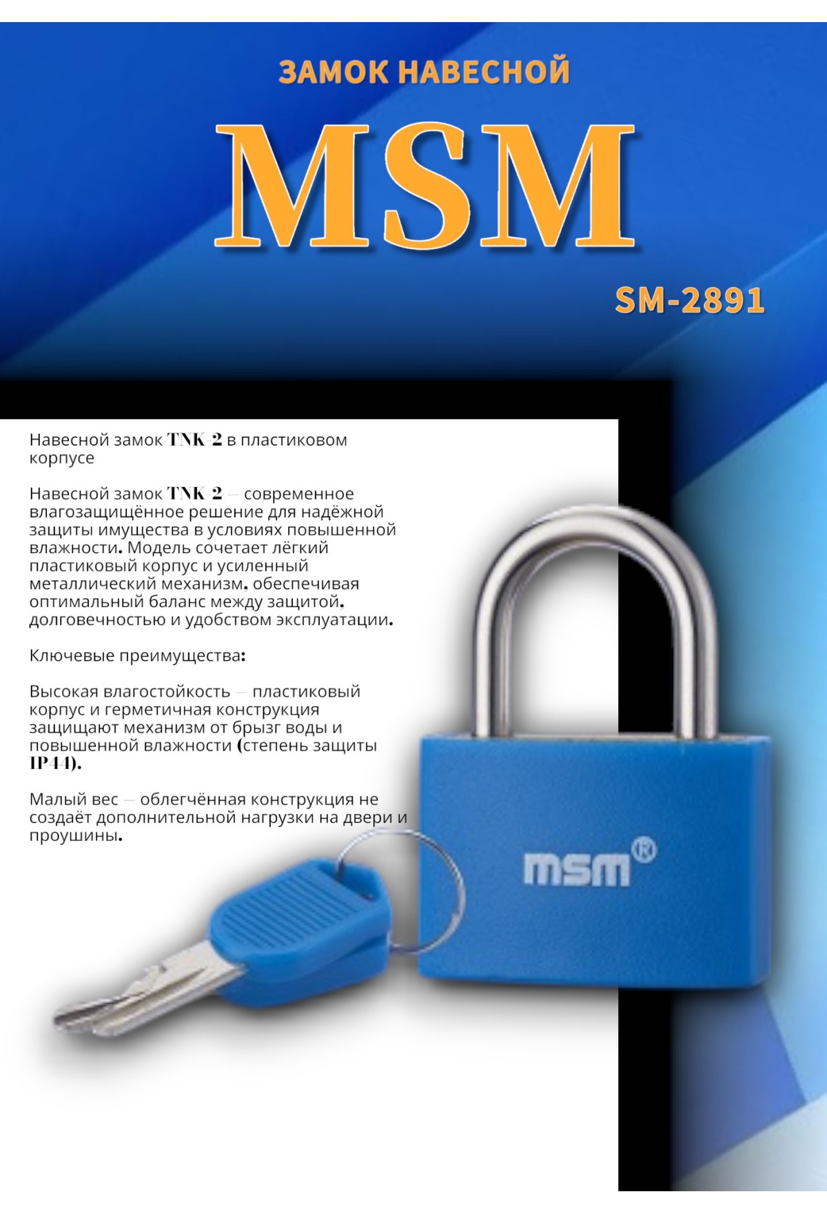 Навесной замок TNK‑2 — современное влагозащищённое решение для надёжной защиты имущества в условиях повышенной влажности. Модель сочетает лёгкий пластиковый корпус и усиленный металлический механизм, обеспечивая оптимальный баланс между защитой, долговечностью и удобством эксплуатации.