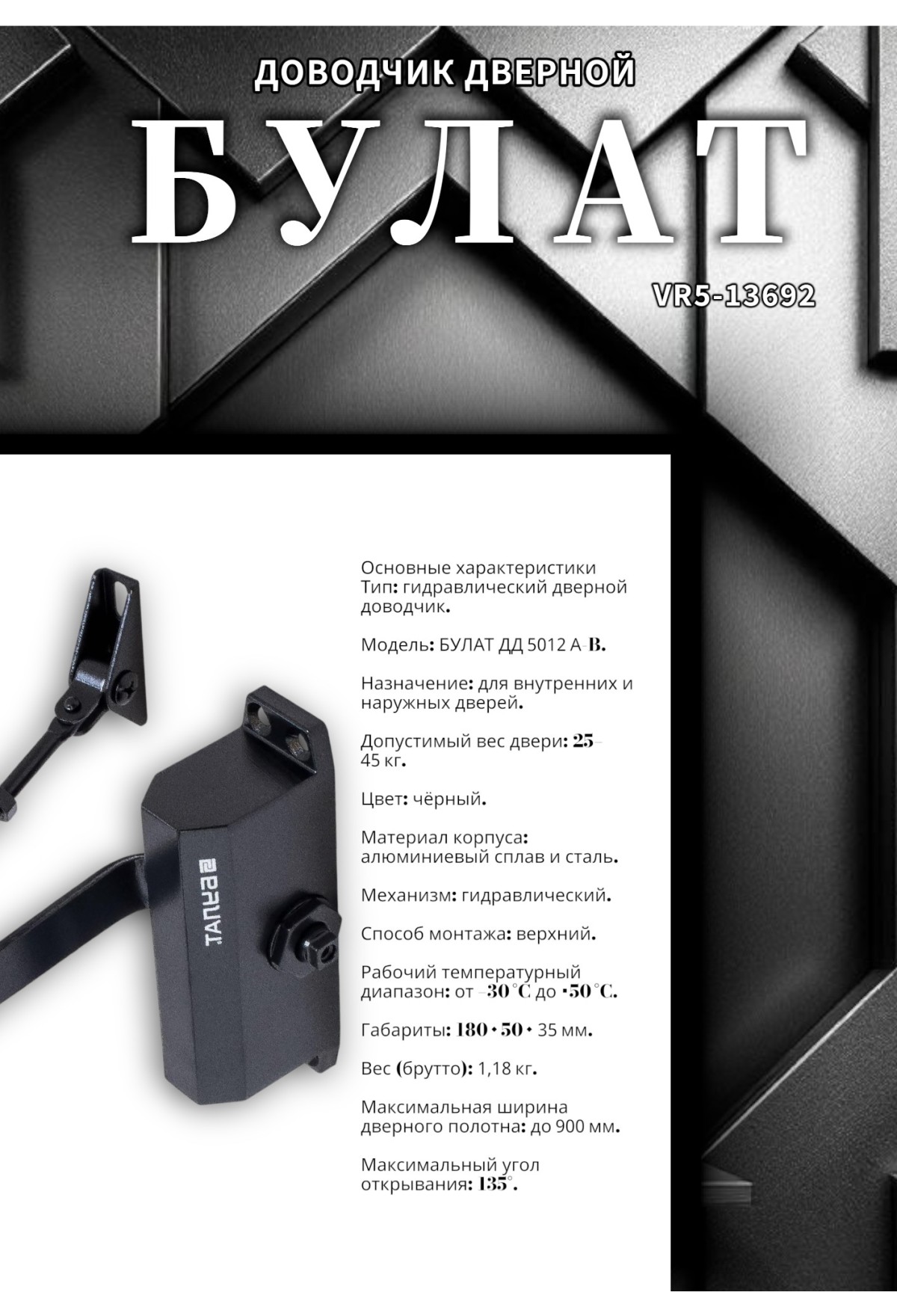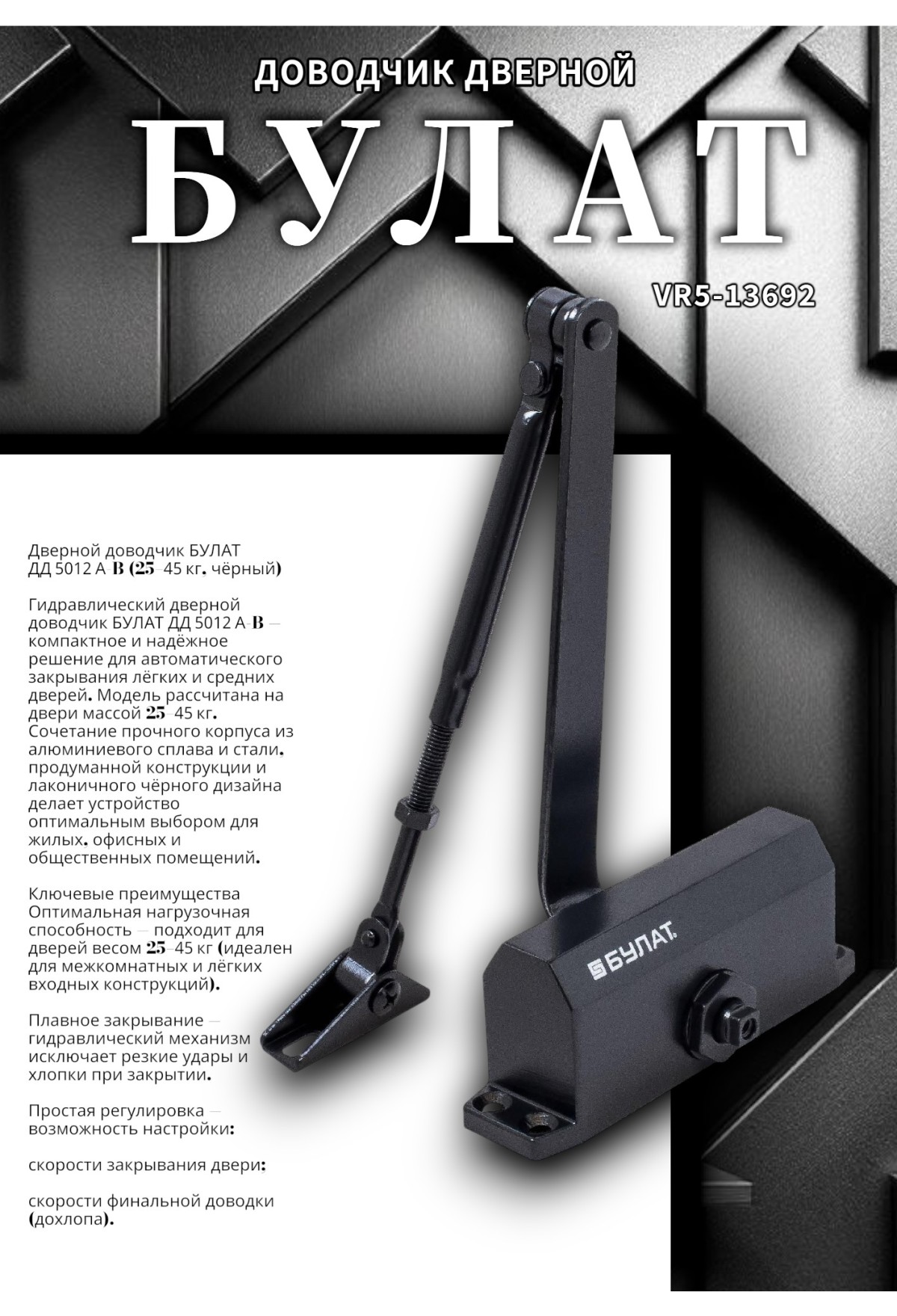 Тэги: БУЛАТ Доводчик дверной ДД 501/2 A-B (25-45 кг) черный (10), VR5-13692, Булат, ✹ Гидравлические дверные доводчики, ✹ Дверные доводчики, ✹ Дверная фурнитура