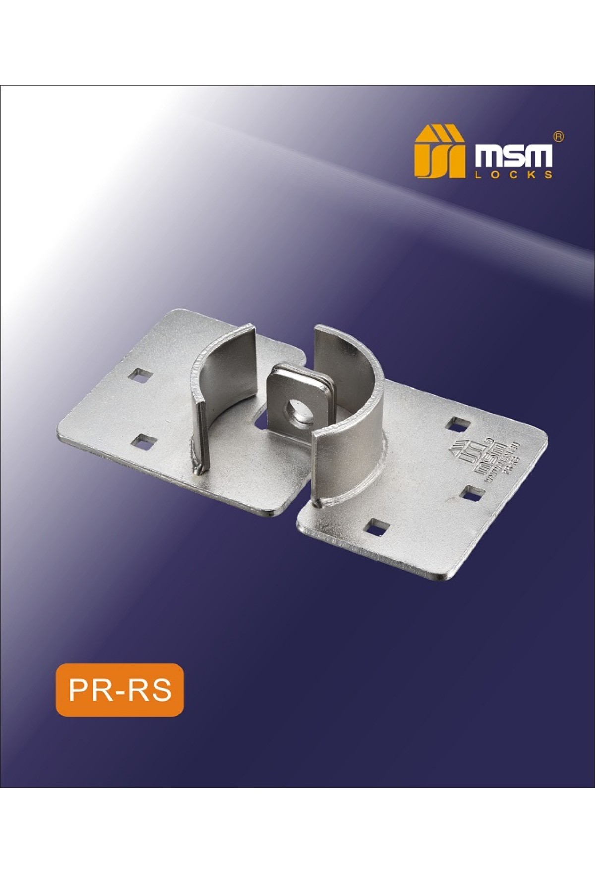 Стальная защита замков RS1-60 и RS2-70. Крепление на 2 половинки двери. При закрытии дверей на дужки накладывается замок и закрывается штырем. Крепежом не комплектуется, для установки рекомендуется сварка. Высокая степень защиты замка.