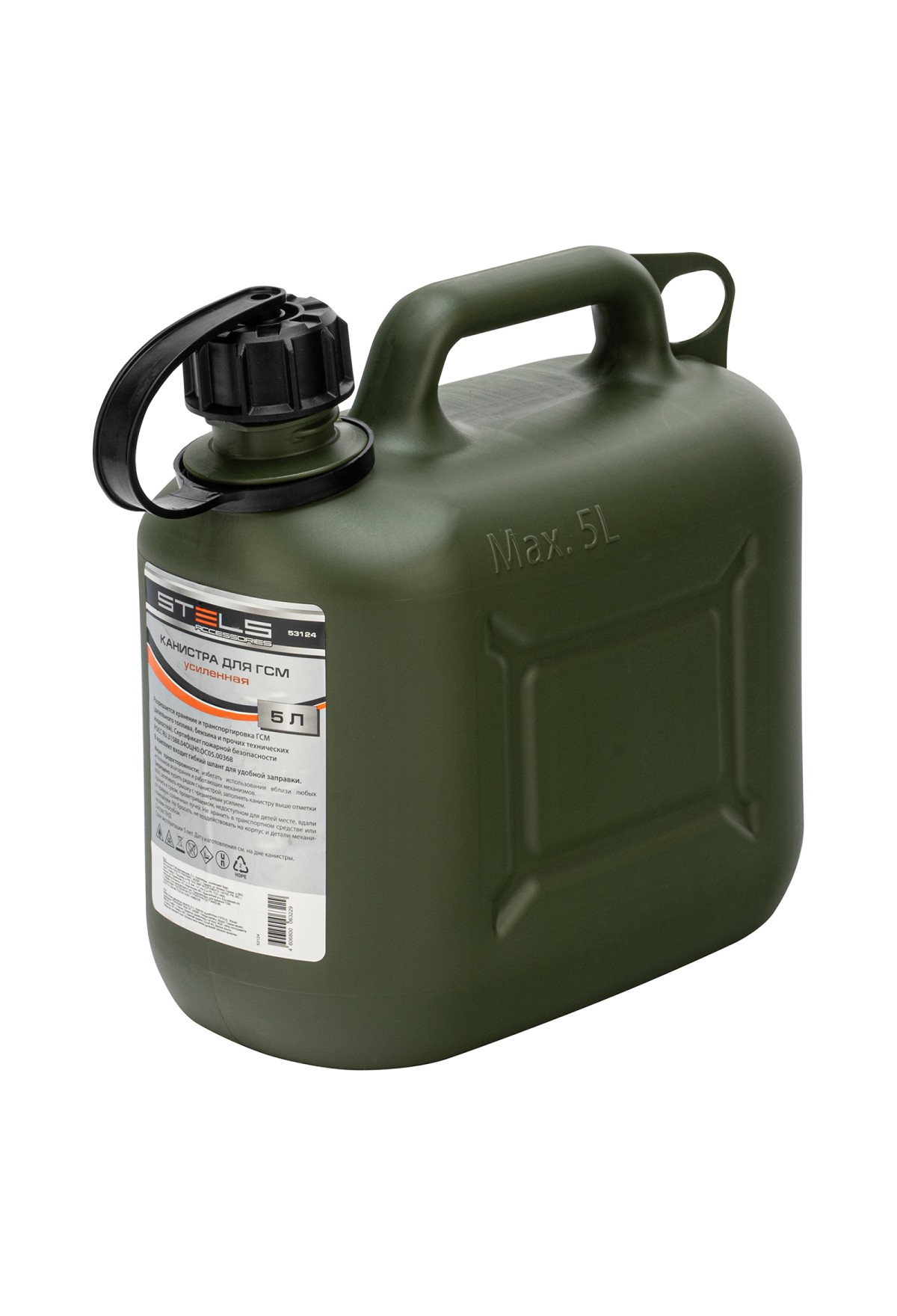 Усиленная пластиковая канистра Stels 53124 объемом 5 л, вертикальная, используется для транспортировки топлива и других ГСМ, а также их хранения в гараже или на даче. Будет полезна для дозаправки автомобиля в дороге. Также пригодится для обслуживания бензотехники: пил, триммеров, газонокосилок и другого оборудования.
