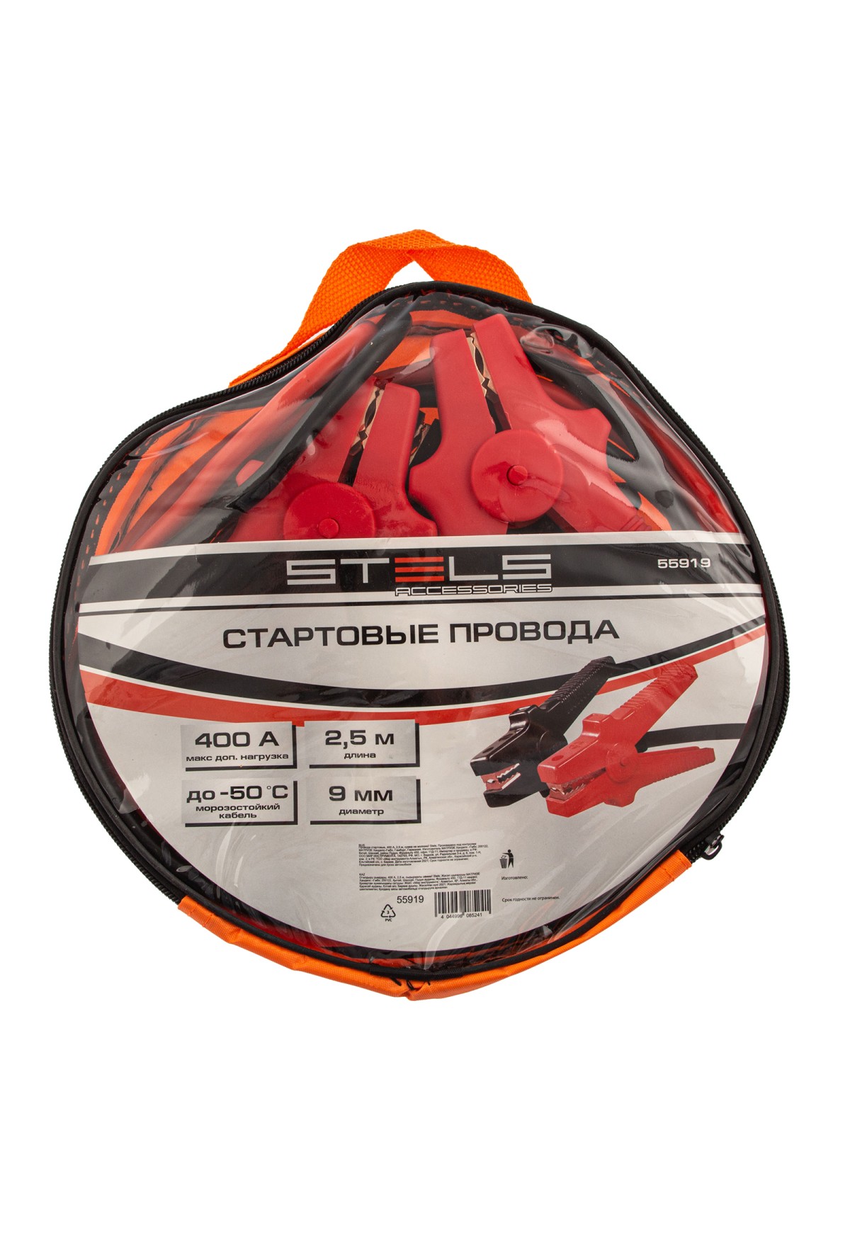 Стартовые провода Stels 55919 длиной 2,5 м, в сумке на молнии, рассчитаны на силу тока 400 А и используются для «прикуривания» легковых и грузовых автомобилей, аккумуляторы которых разрядились по причине низкой окружающей температуры или длительного хранения. Допустимой силы тока 400 A достаточно для запуска стартеров большинства автомашин. Провода пригодятся автовладельцам.
