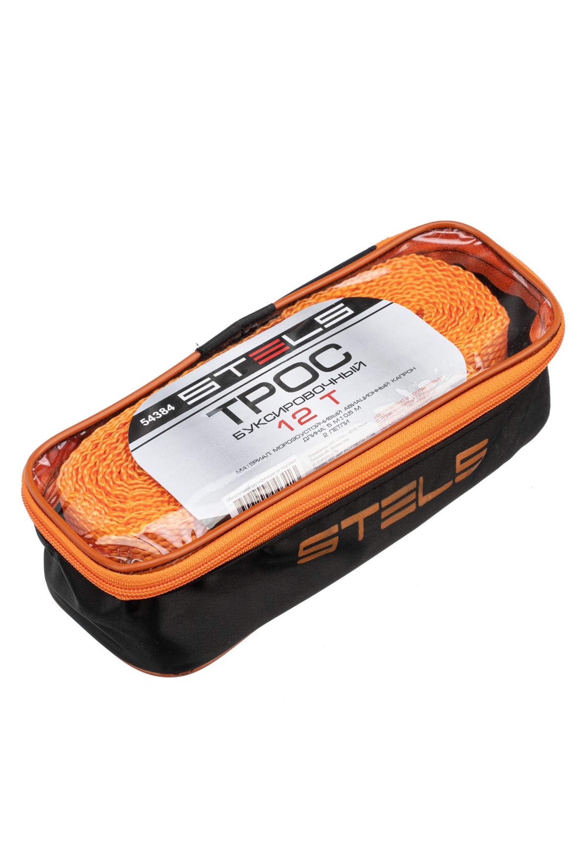 Буксировочный трос Stels 54384 с 2 петлями, в сумке на молнии, используется для буксировки на гибкой сцепке автомобилей весом до 12 тонн. Он выручит водителей грузовых автомобилей при попадании в сложную ситуацию на дороге: если закончилось топливо, сломался двигатель, застряли колеса и т.д.
