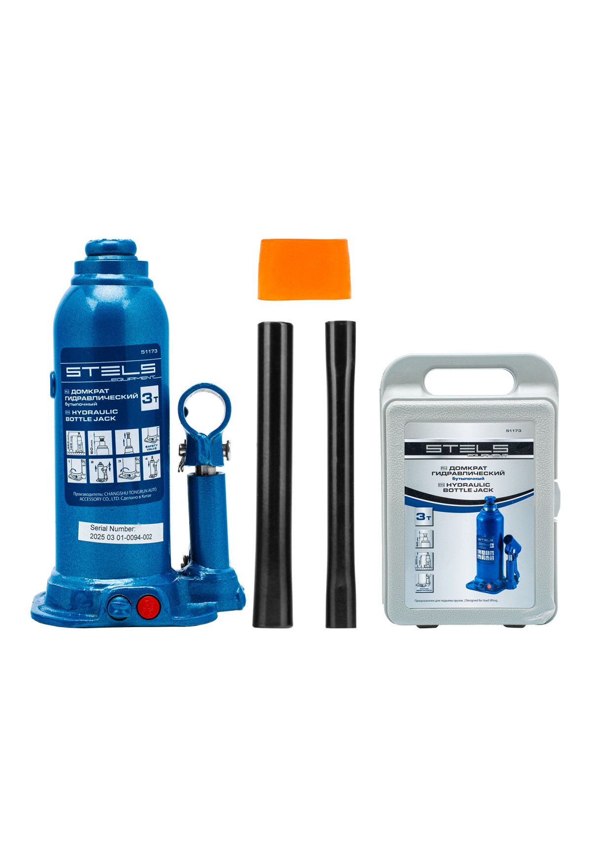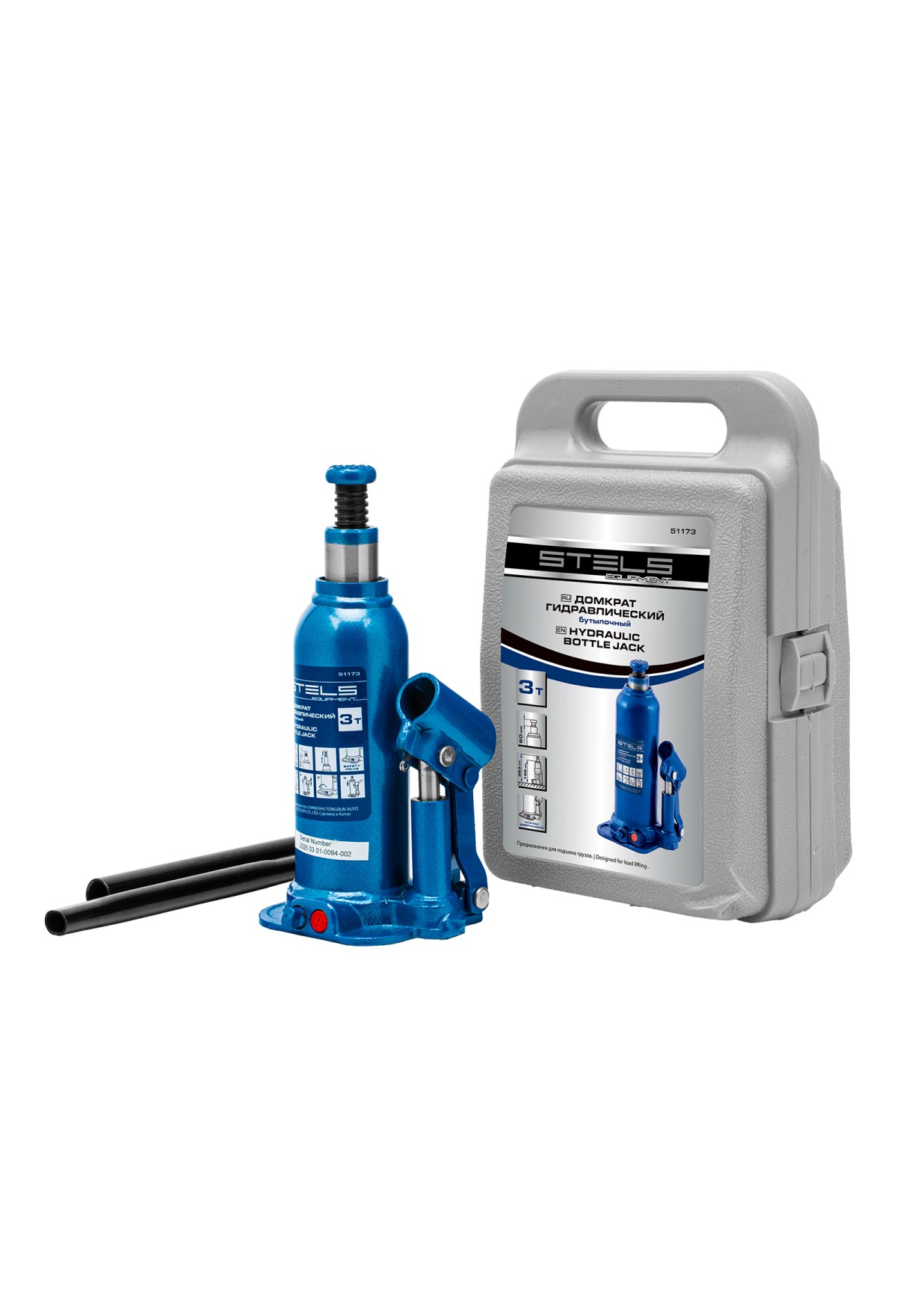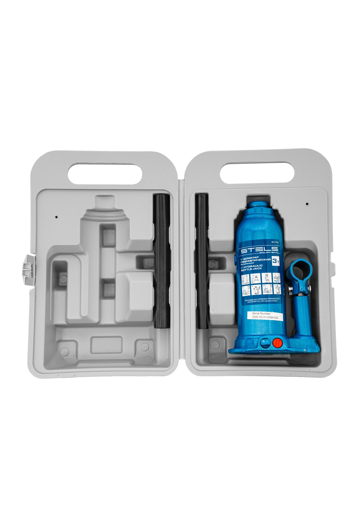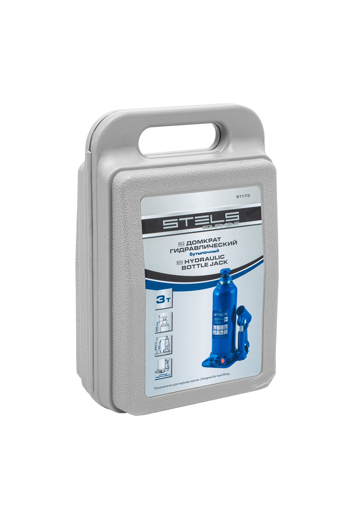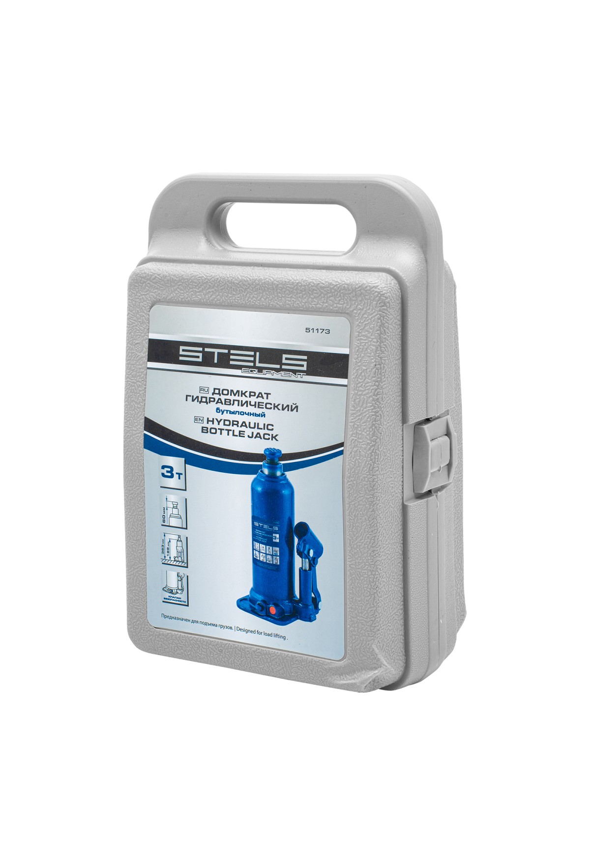 Гидравлический бутылочный домкрат Stels 51173 в пластиковом кейсе предназначен для поднятия грузов весом до 3 т на высоту 188-363 мм. Он не занимает много места и легко помещается в багажник, поэтому его можно брать с собой в дорогу или хранить в гараже. Используется для самостоятельного ремонта авто, также подходит для профессионального применения на станциях технического обслуживания.