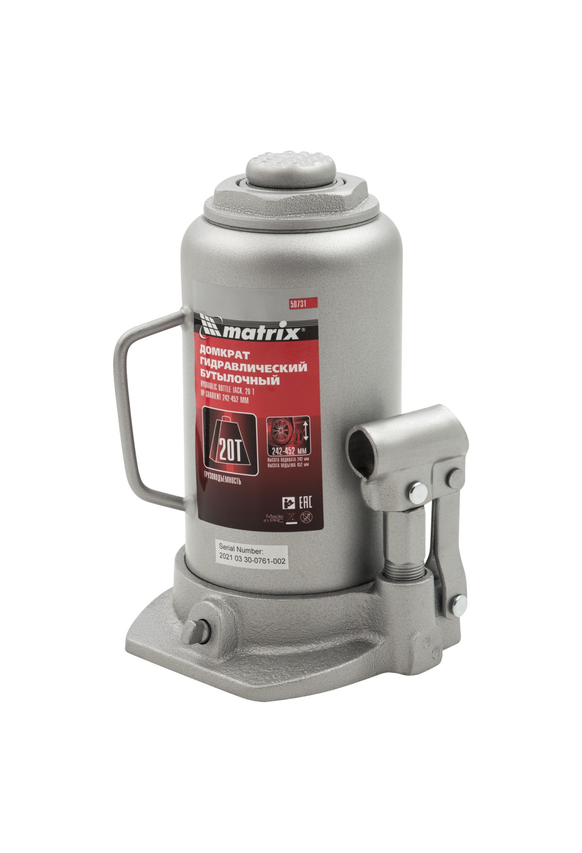Технические характеристики Домкрат гидравлический бутылочный, 20 т, высота подъема 242-452 мм Matrix
