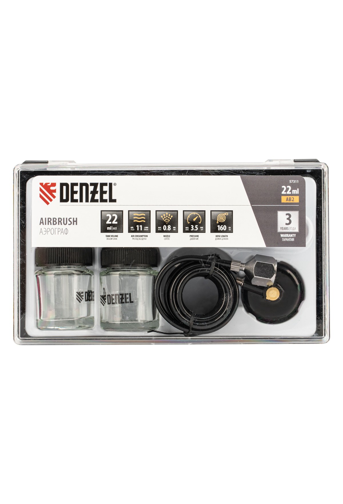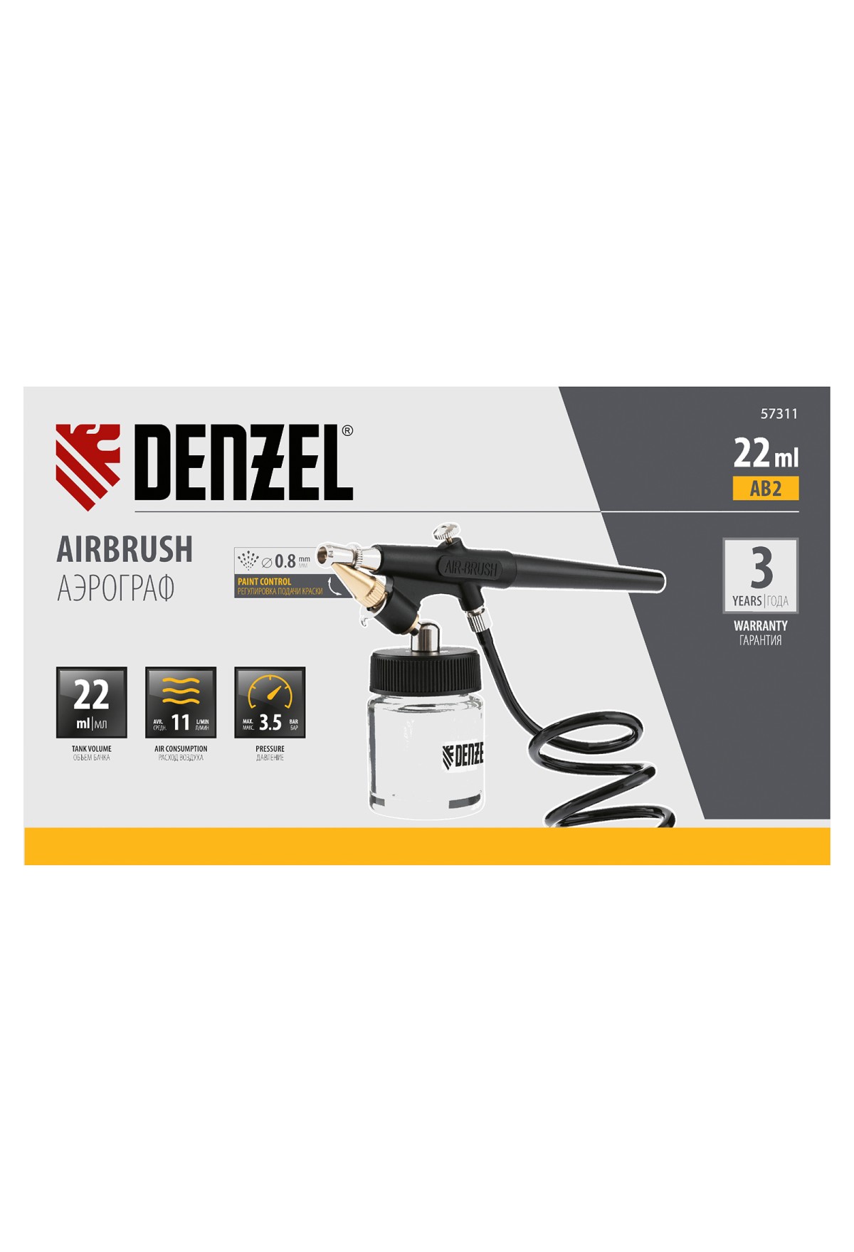 Аэрограф Denzel AB2 57311 с нижним бачком объемом 22 мл расходует 11 л сжатого воздуха в минуту и формирует струю краски диаметром 0,8 мм. Предназначен для выполнения тонких художественно-декоративных и покрасочных работ. Имеет курок одинарного действия: скорость воздушного потока постоянна на протяжении всего времени работы. Аэрограф позволяет создавать рисунки на кузовных элементах автомобилей, мото- и другой техники, а также на прочих поверхностях.
