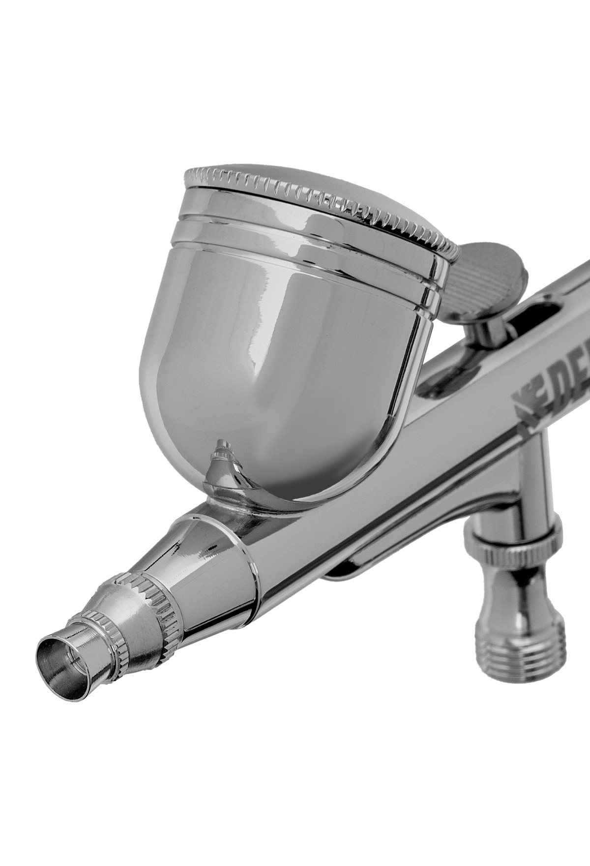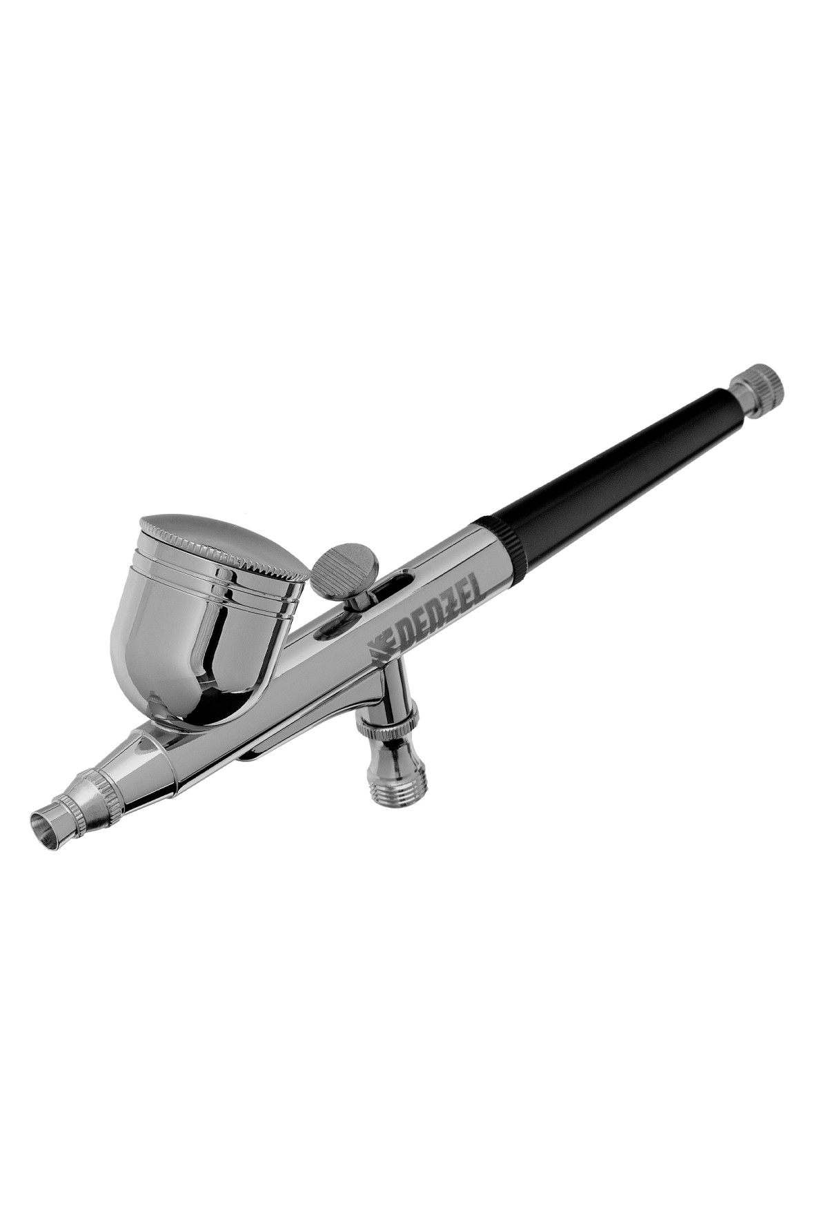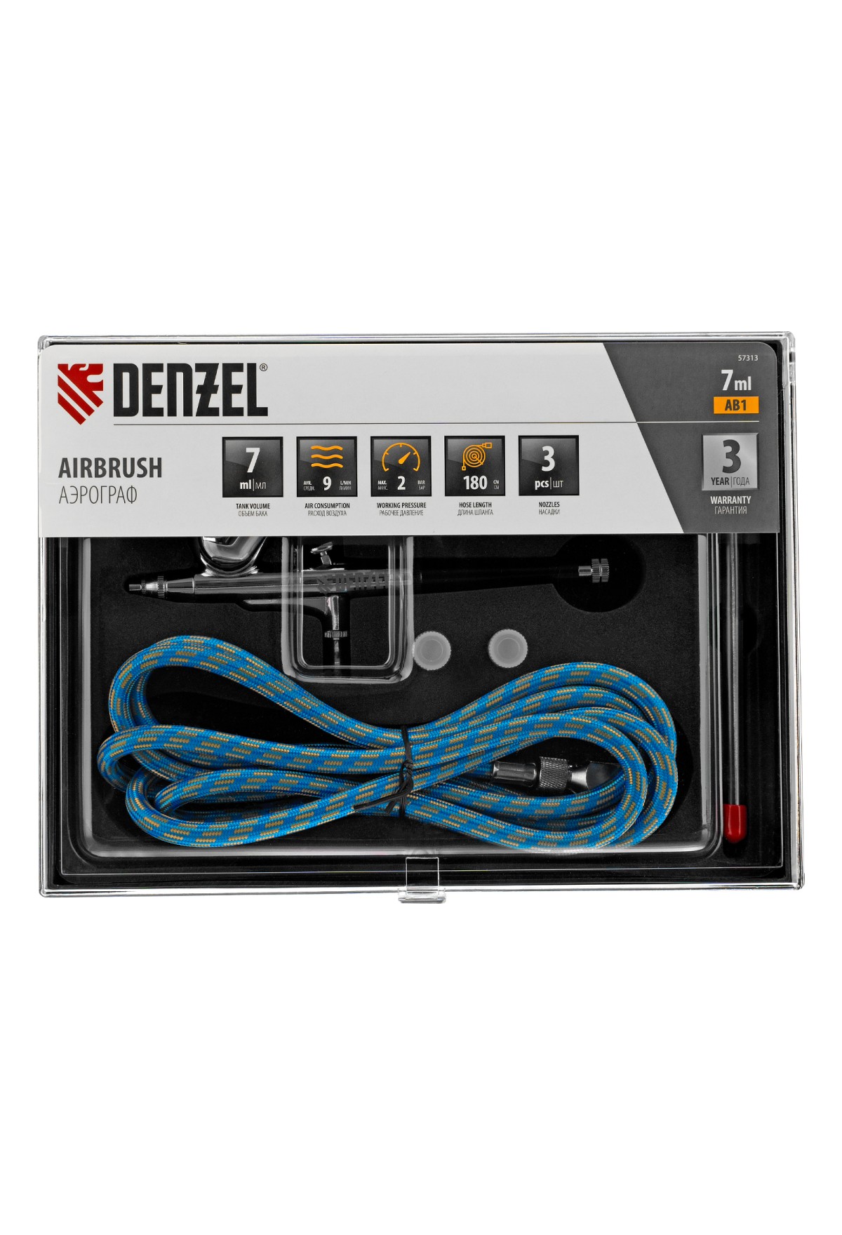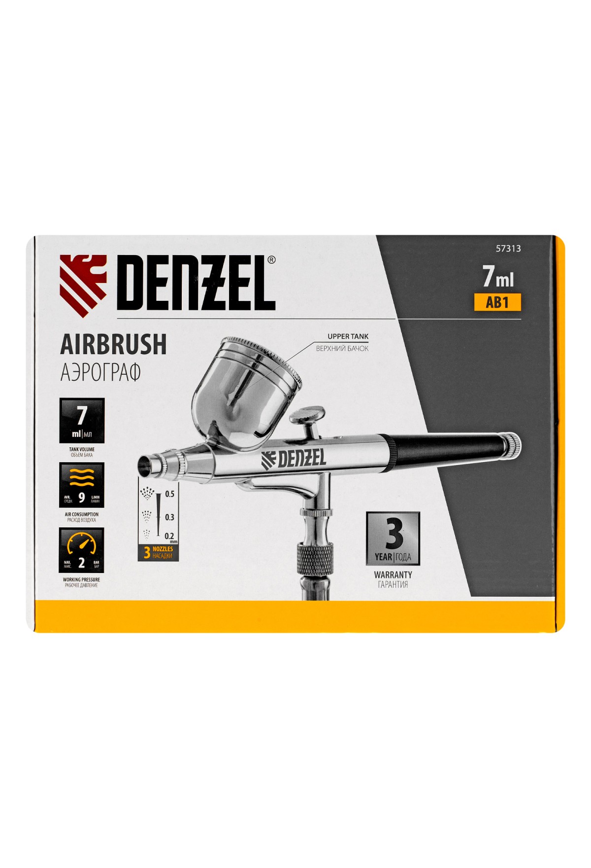 Аэрограф Denzel AB1 57313 с верхним бачком объемом 7 мл распыляет краску, расходуя 9 л сжатого воздуха в минуту и формируя струю диаметром 0,2, 0,3 или 0,5 мм. Позволяет наносить лакокрасочный материал (ЛКМ) тонким слоем, обеспечивает четкую прорисовку мелких деталей. Формирует тонкие и широкие линии, удобен для нанесения ЛКМ круговыми движениями, а также получения точек различного размера. При помощи аэрографа можно создавать рисунки на кузовных элементах автомобилей, мото- и другой техники, а также на прочих поверхностях.