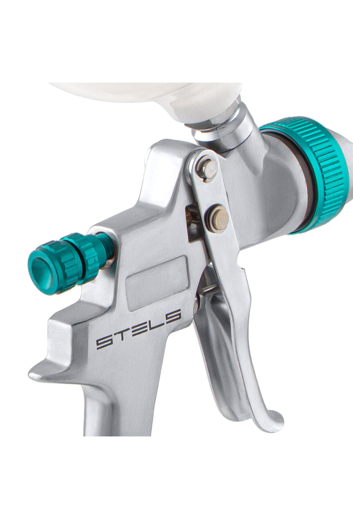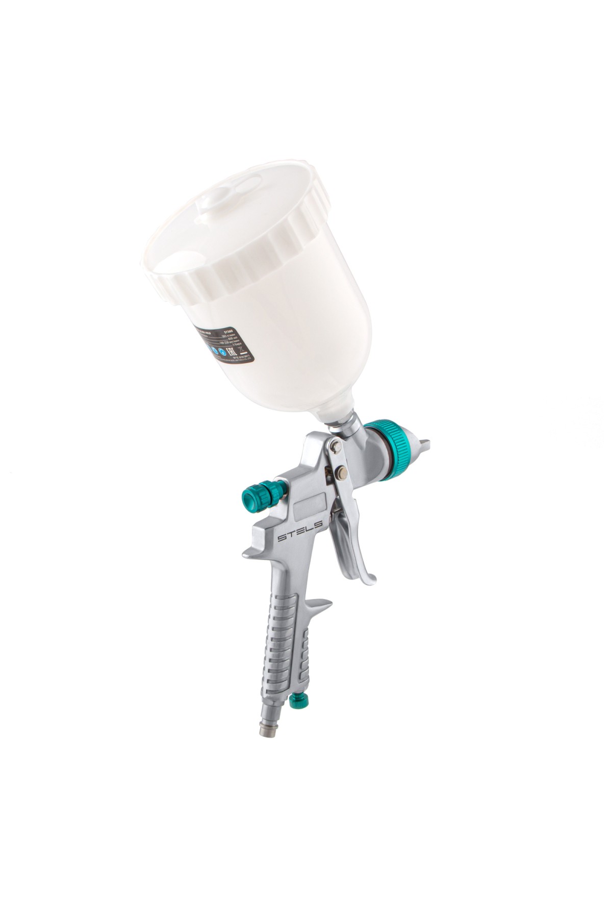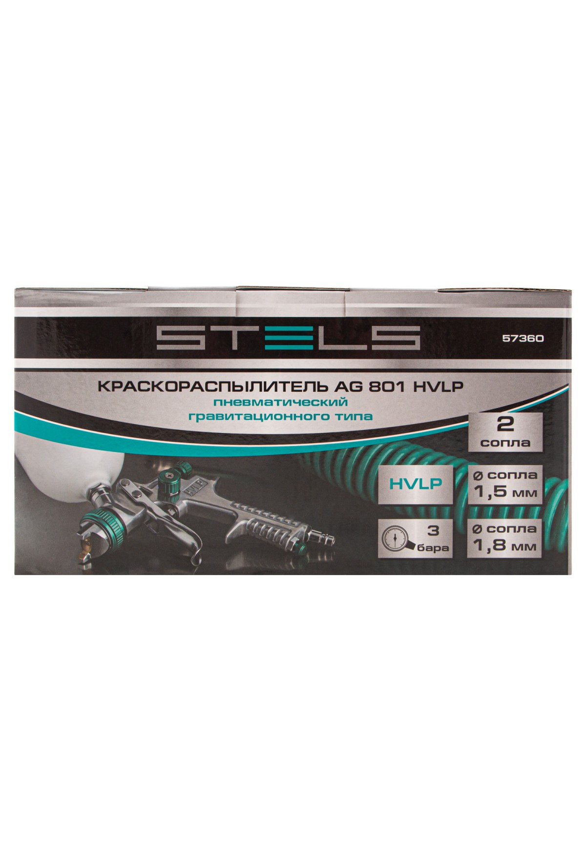 Гравитационный краскораспылитель Stels AG 801 HVLP 57360 с соплами диаметром 1,5 и 1,8 мм предназначен для равномерного окрашивания поверхностей практически любым из представленных на рынке лакокрасочных материалов — от легкого автомобильного до тяжелого строительного. Он найдет применение в быту, гаражах, автосервисах, на стройках и частных мастерских.,Технология HVLP «Высокий объем/низкое давление» обеспечивает разницу между входным и выходным давлением 2/0,7 бар. Такие параметры позволяют добиться 65% переноса окрасочного материала на поверхность, что на 30-35% выше, чем у пультов с высоким давлением.