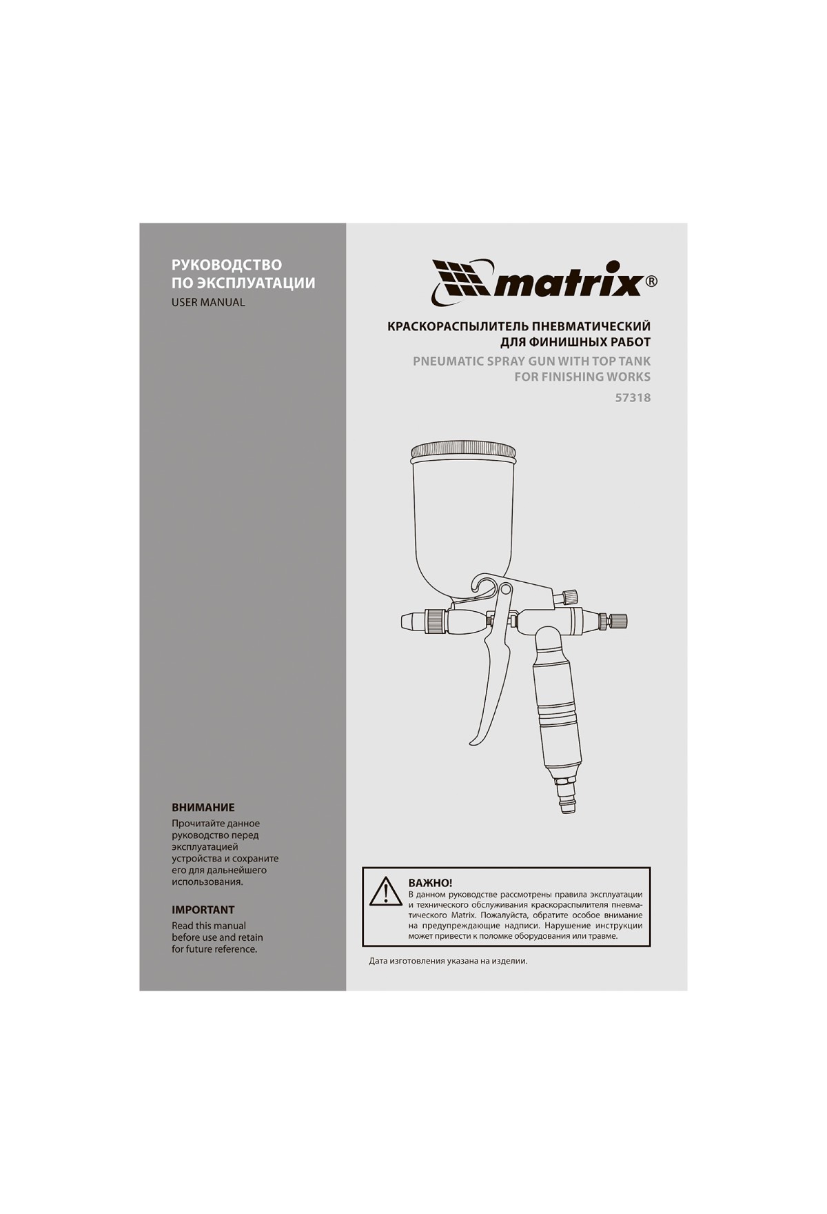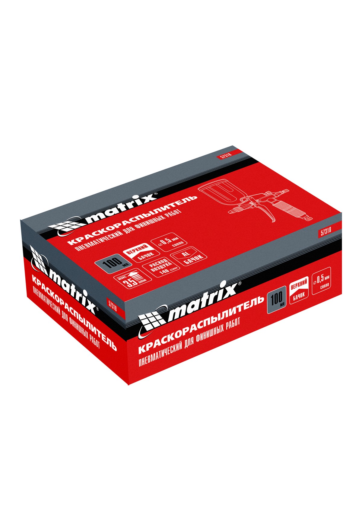 Технические характеристики Краскораспылитель пневматический для финишных работ с верхним бачком V 0,1 л, сопло D 0.5 мм Matrix
