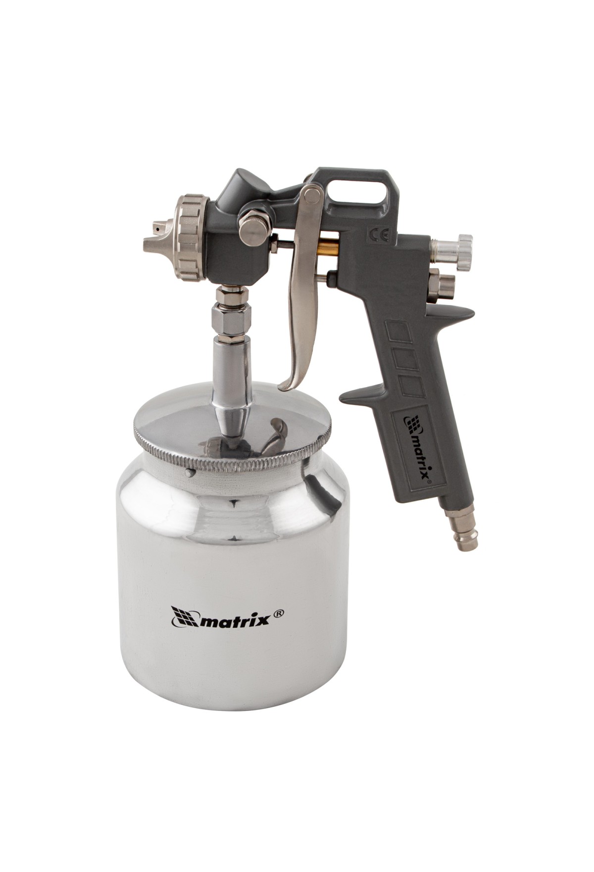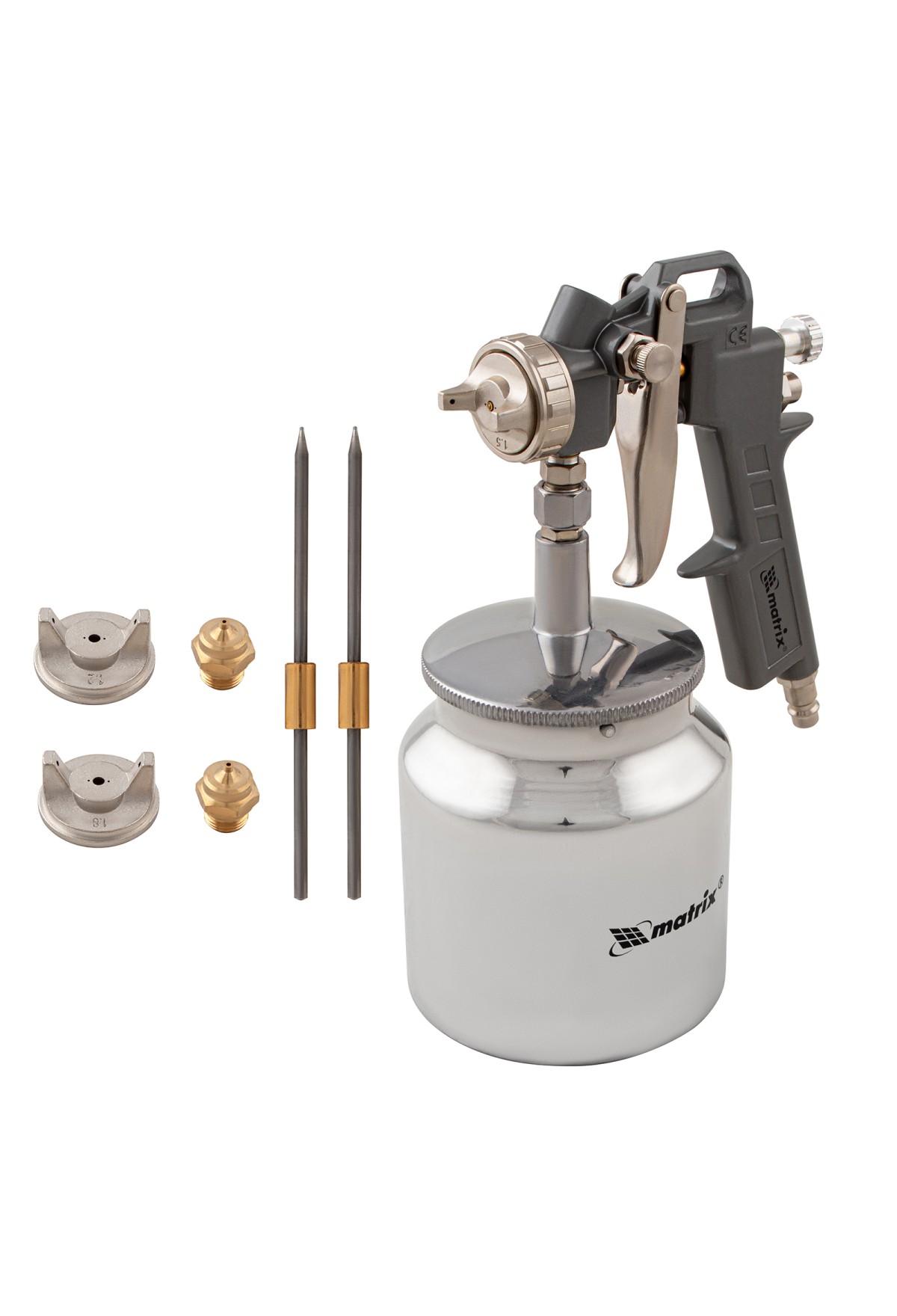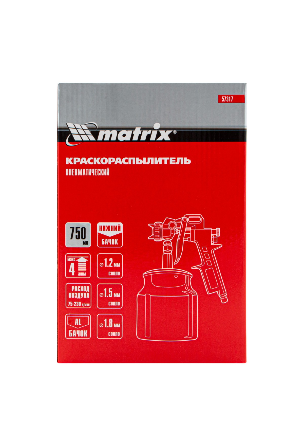 Пневматический краскораспылитель Matrix 57317 с нижним бачком объемом 0.75 л и соплами диаметром 1,2, 1,5 и 1,8 мм используется для окрашивания металлических, деревянных, керамических и пластмассовых поверхностей. Благодаря сменным соплам краскораспылитель может работать с различными по густоте составами: лаком, шпаклевкой, краской. Он пригодится на стройке, в автомастерской и на мебельном производстве.