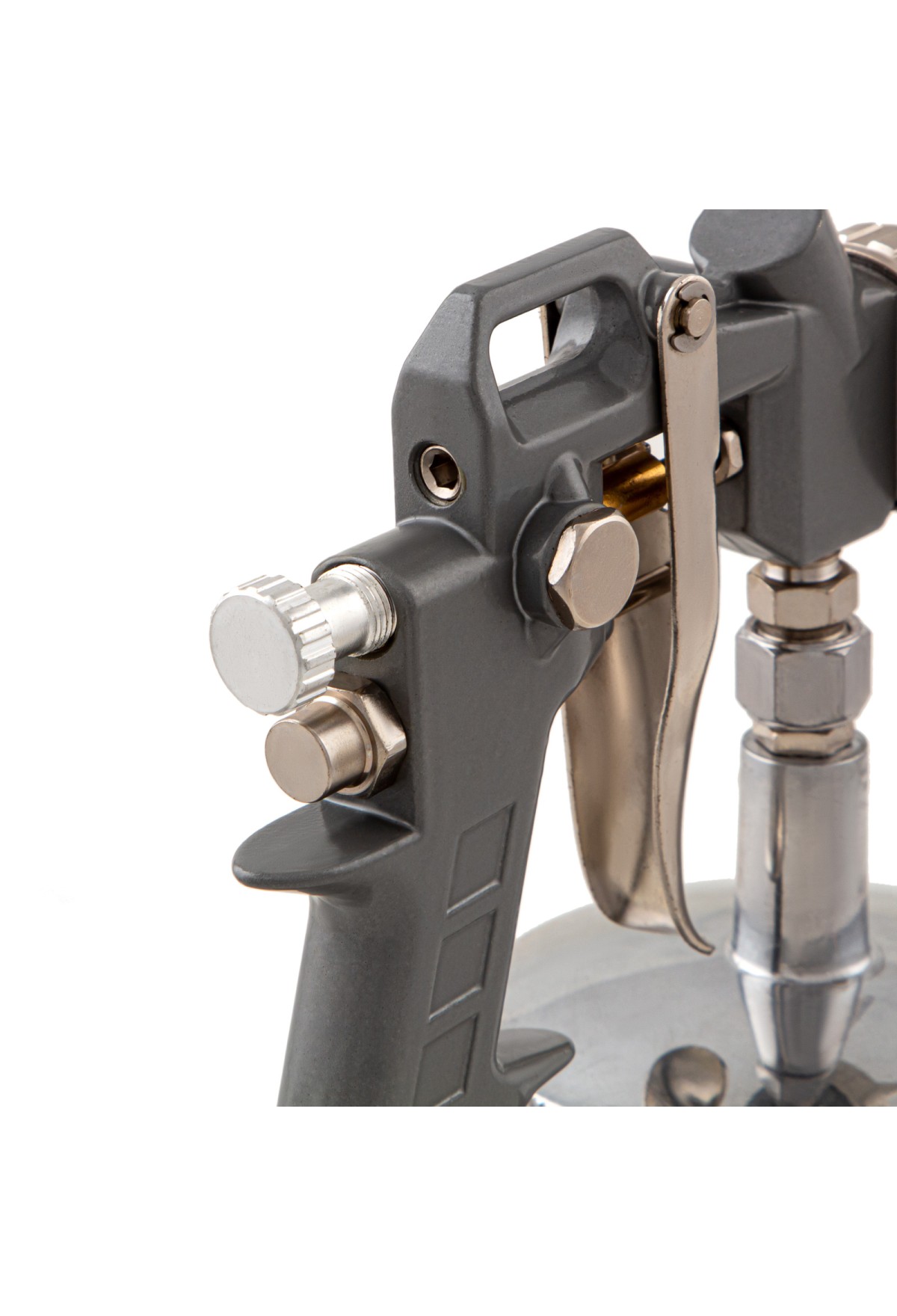 - Нижнее расположение бака — краскораспылитель можно ставить на горизонтальные поверхности, также он не загораживает обзор в процессе работы.