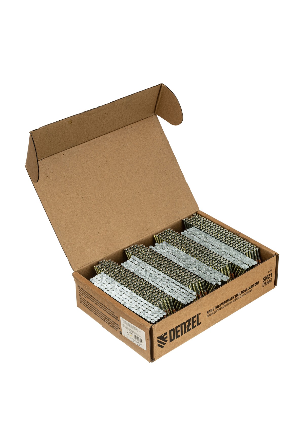 Оцинкованные гвозди Denzel 57687 типа SN21, длиной 75 мм и диаметром 3,05 мм, 2000 шт. в упаковке, — расходники для пневматического нейлера. Используются для скрепления различных материалов, будут полезны во время сборочных и отделочных работ.
