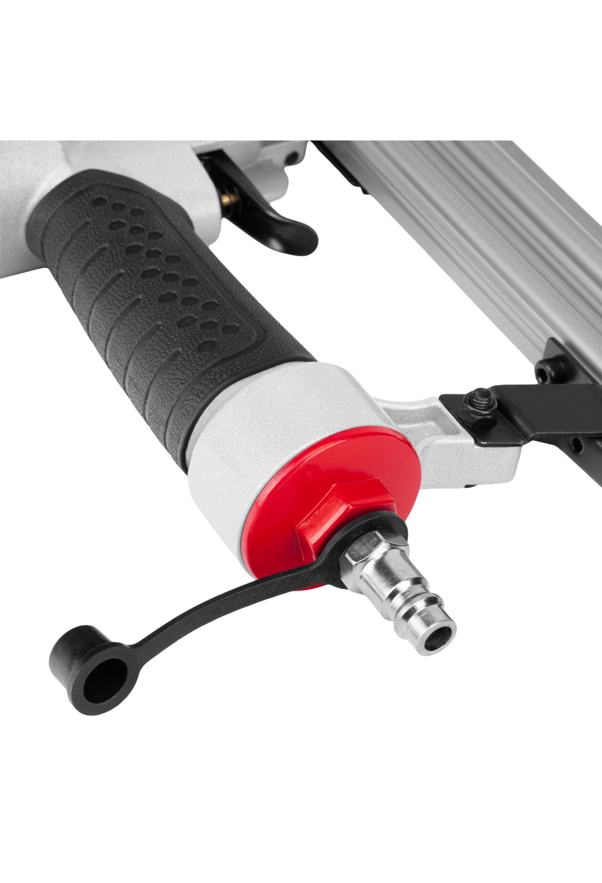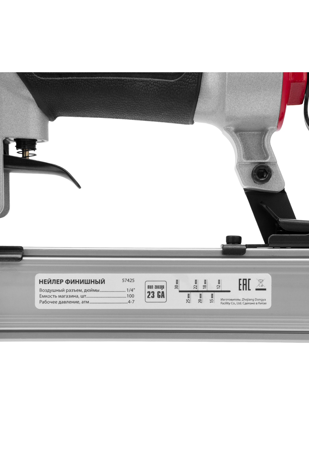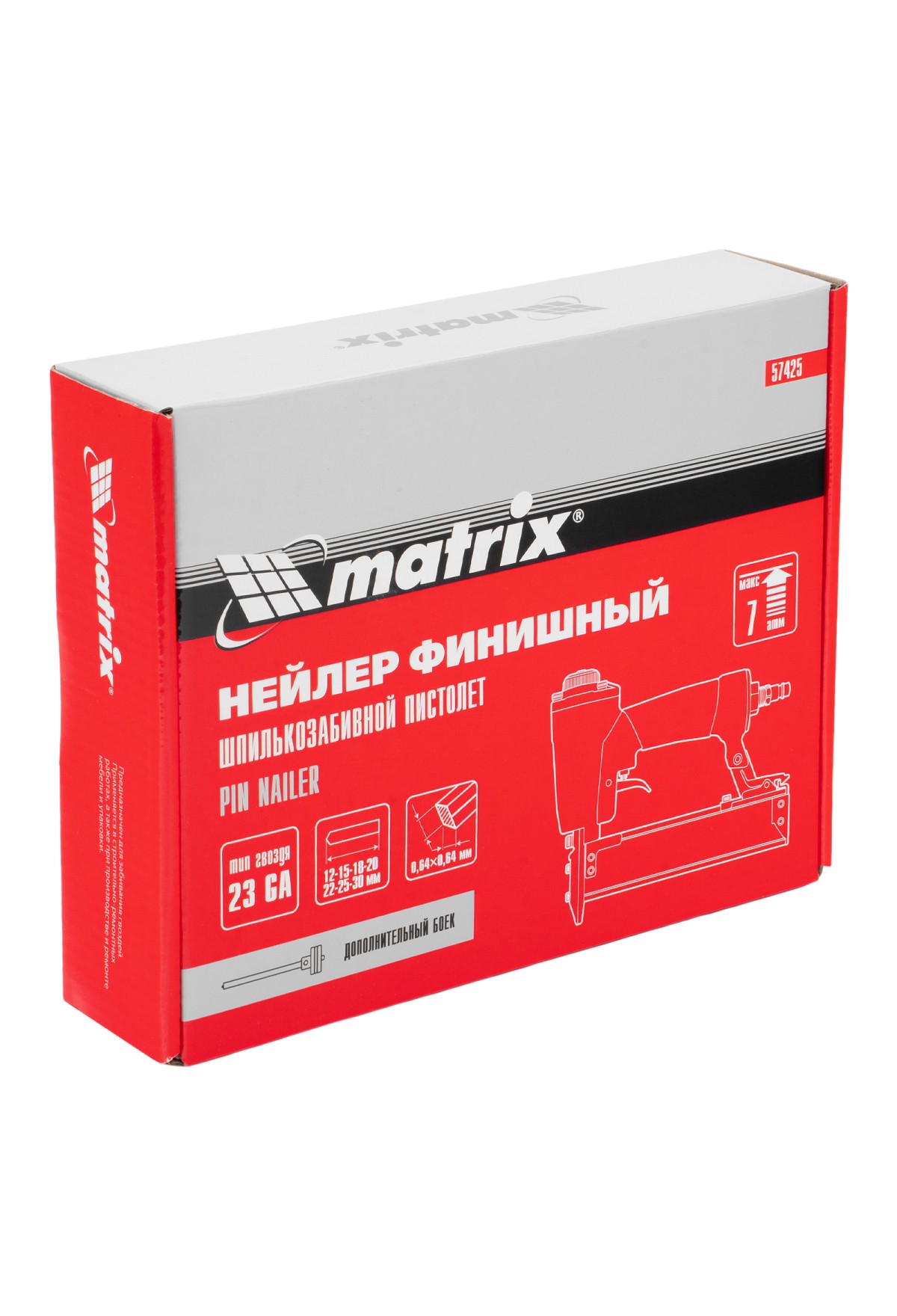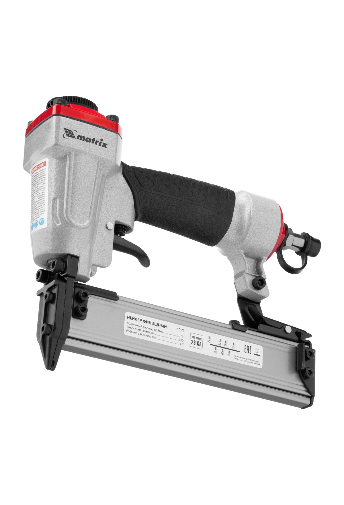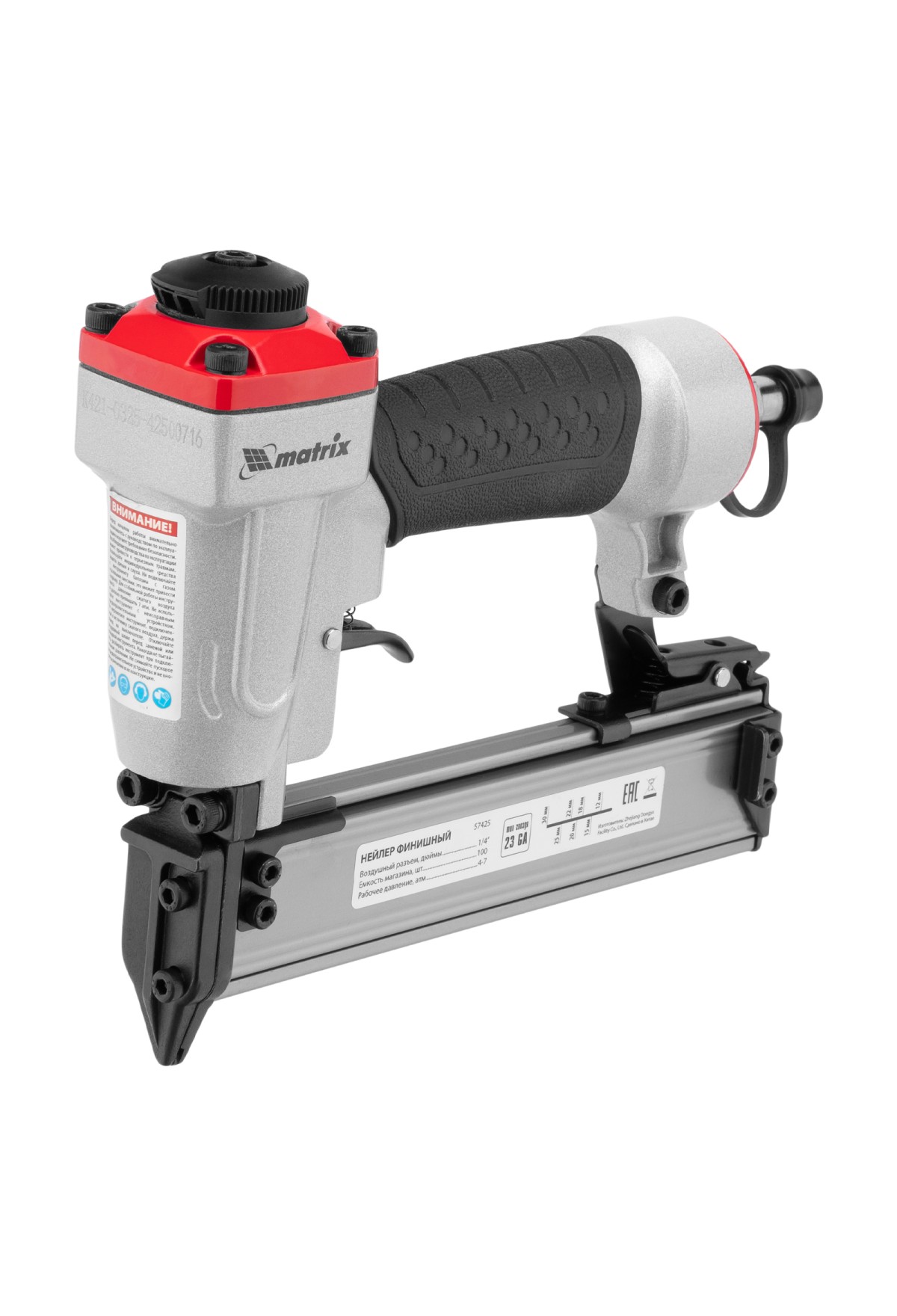 Пневматический финишный нейлер Matrix 57425 (шпилькозабивной пистолет) предназначен для забивания гвоздей 23GA диаметром 0,64 мм и длиной 10-30 мм. Он используется для финишной отделки, а также сборки мебели и производства упаковки. Благодаря низкому расходу воздуха 0,7 л/мин нейлер совместим с любым типом компрессоров.