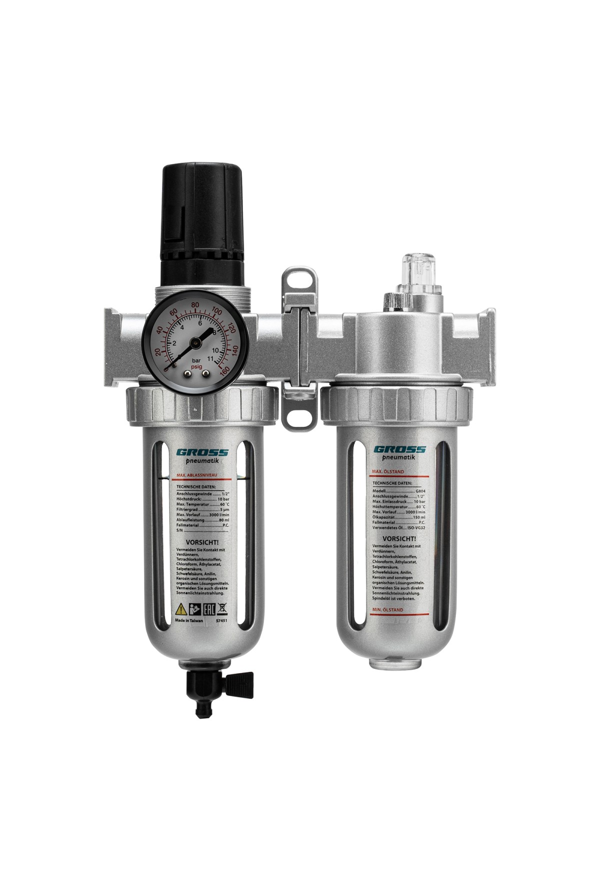 Блок подготовки воздуха Gross G804 57451 с присоединительной резьбой 1/2 дюйма одновременно выполняет функции регулятора уровня давления, фильтра и лубрикатора. Устройство используется с компрессорами, работающими под давлением до 10 бар, и будет полезно на производстве, строительной площадке и в автомастерской.