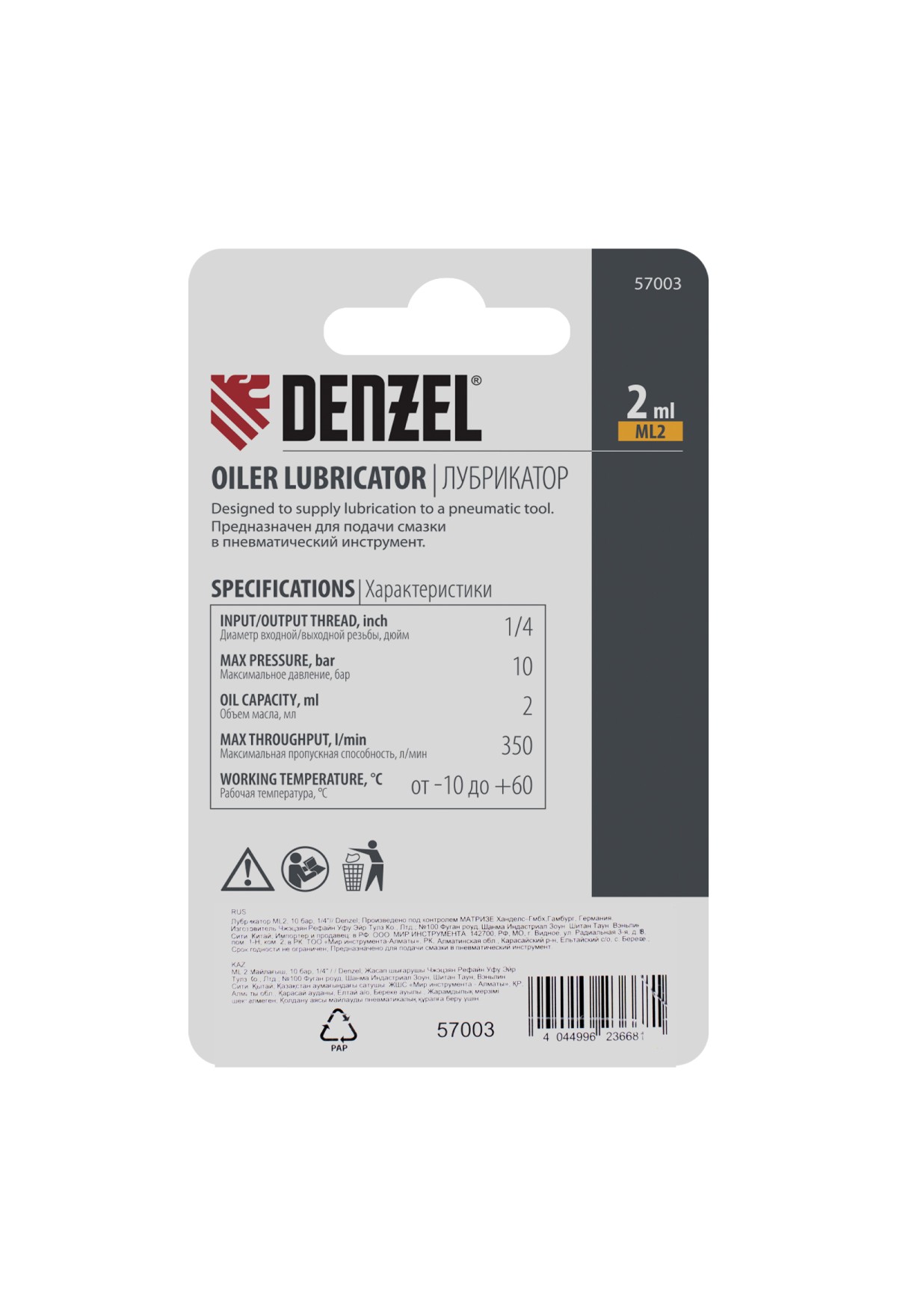 Технические характеристики Лубрикатор ML2, 10 бар, 1/4" Denzel