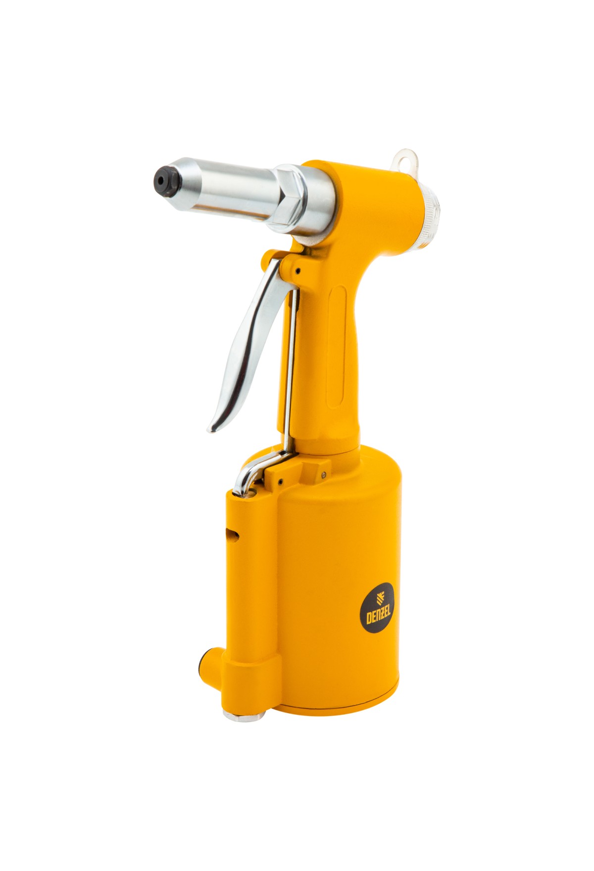Пневматический заклепочник Denzel PR4 57479 значительно упрощает работу в автосервисах, домашних мастерских, на малых предприятиях и на ремонтных площадках. С его помощью можно без усилий скрепить листовой, профильный и панельный материал из пластика и металла.,Пистолет для вытяжных заклепок работает под давлением 6,3 АТМ и расходует всего 85 литров воздуха в минуту, поэтому для него подойдет компрессор средней мощности. В качестве оснастки используются заклепки размером 2,4-4,8 мм. В комплект поставки входит 4 насадки под заклепки размерами 2,4 мм, 3,2 мм, 4 мм и 4,8 мм.