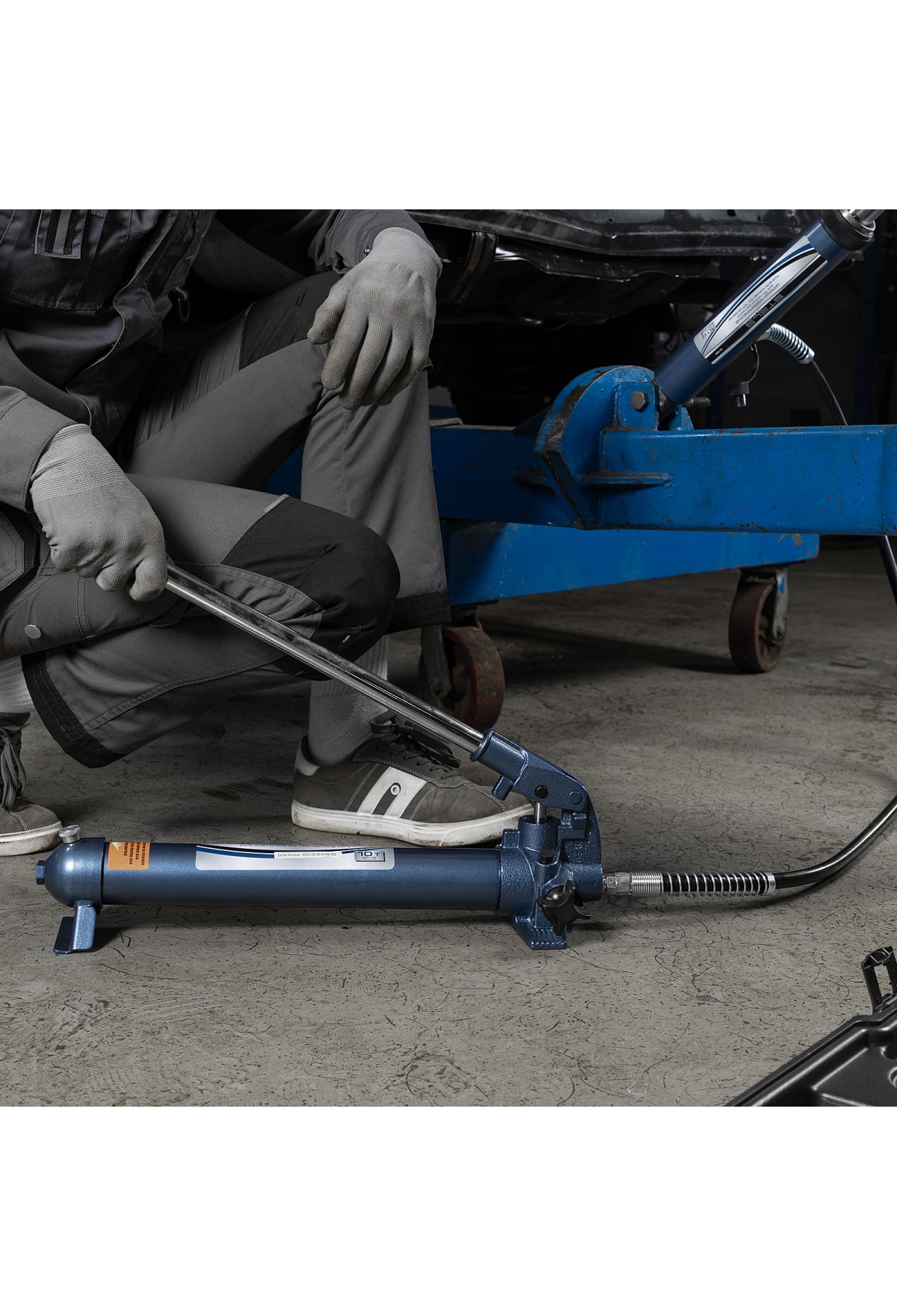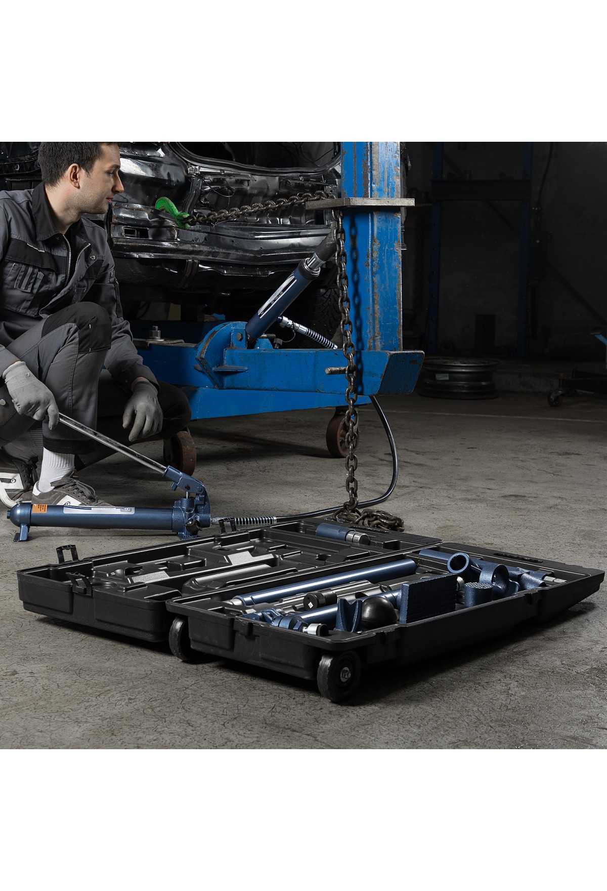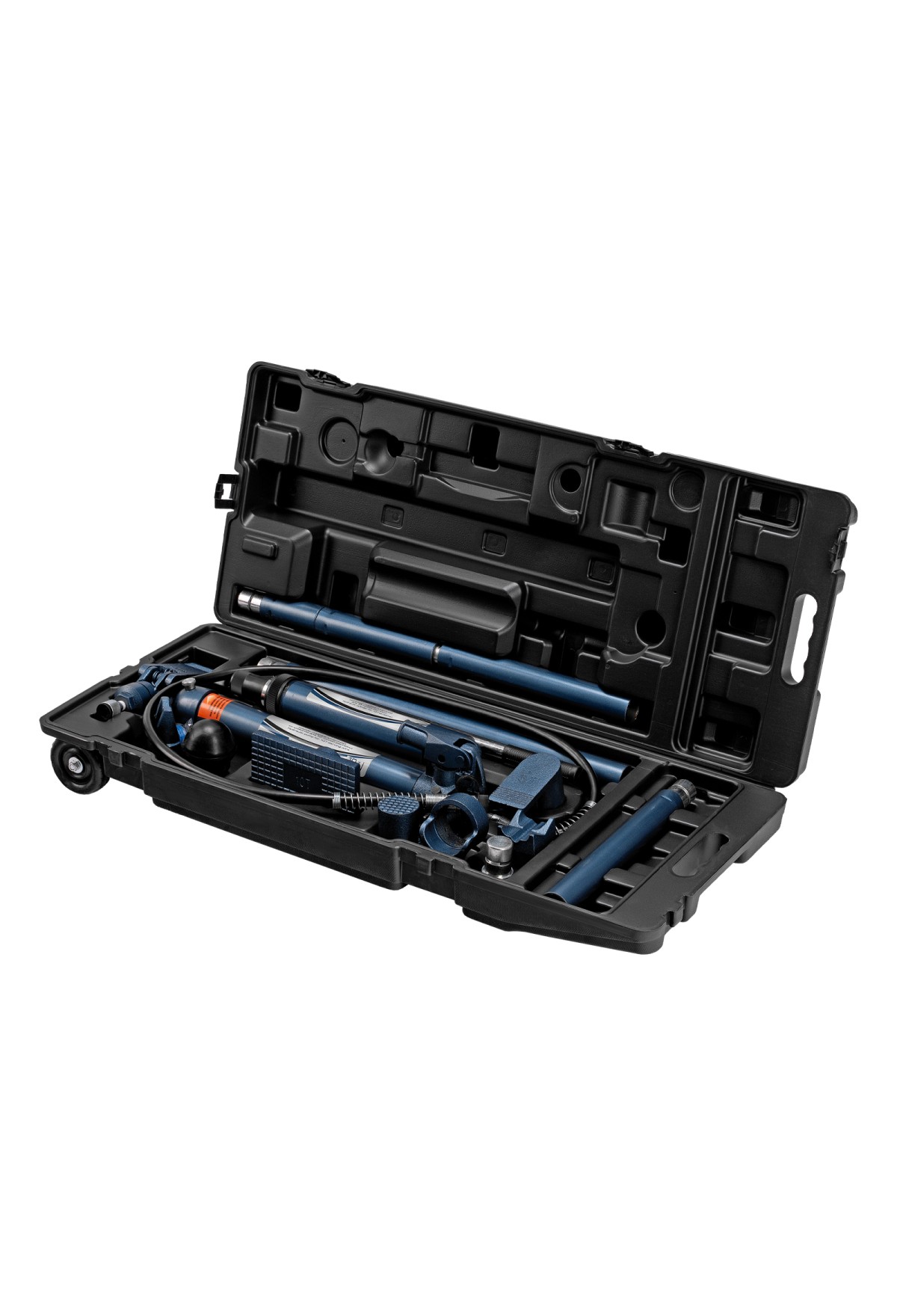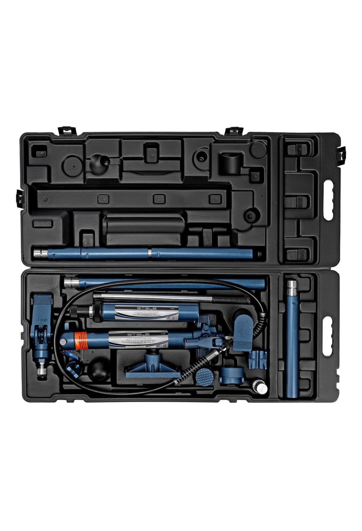 • Растяжка гидравлическая, 10 т, набор из 17 предметов, 7 сменных насадок, в пластиковом кейсе на колесах Stels