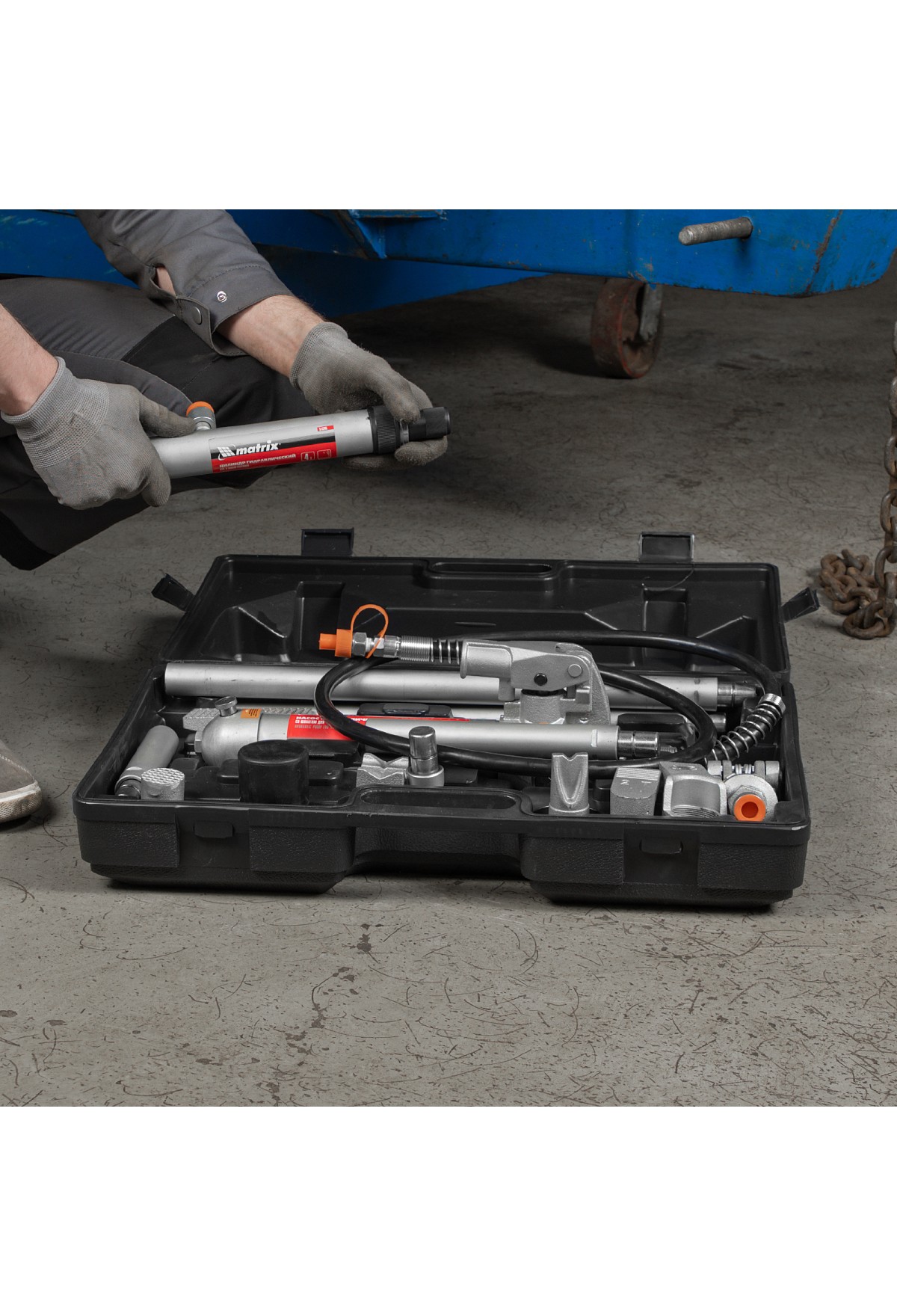 • Растяжка гидравлическая, 4 т, набор из 17 предметов, 7 сменных насадок, в пластиковом кейсе Matrix