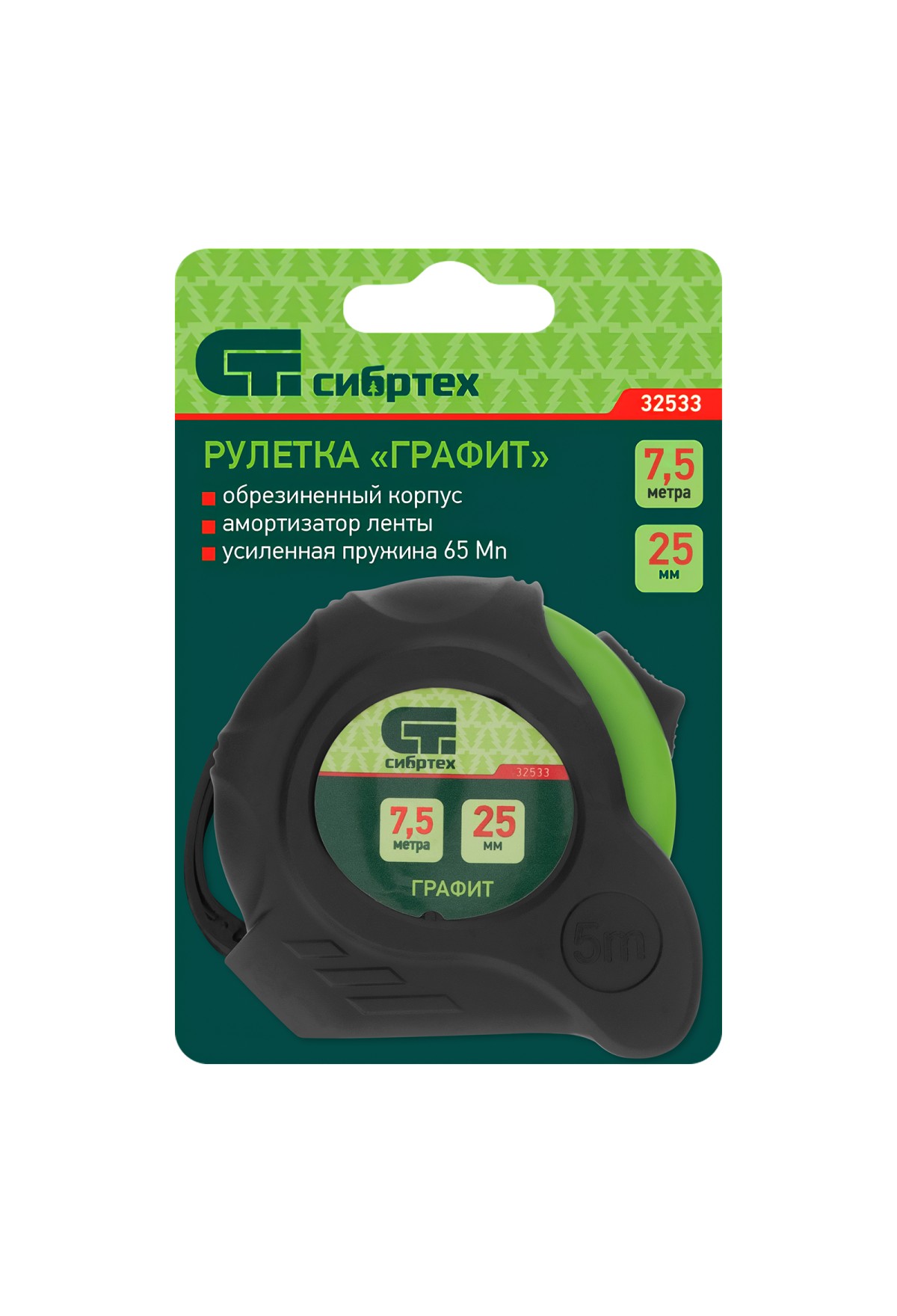Технические характеристики Рулетка Графит,обрезиненный корпус,амортизатор,7,5 м х 25 мм Сибртех